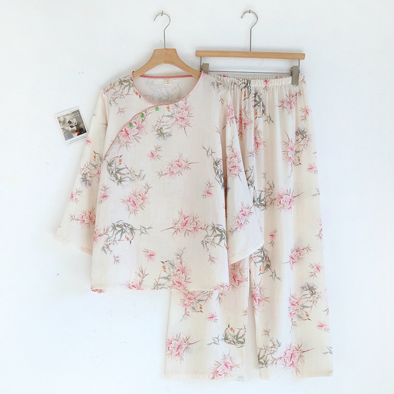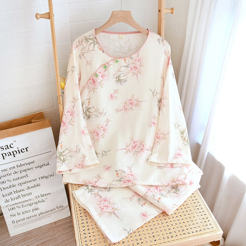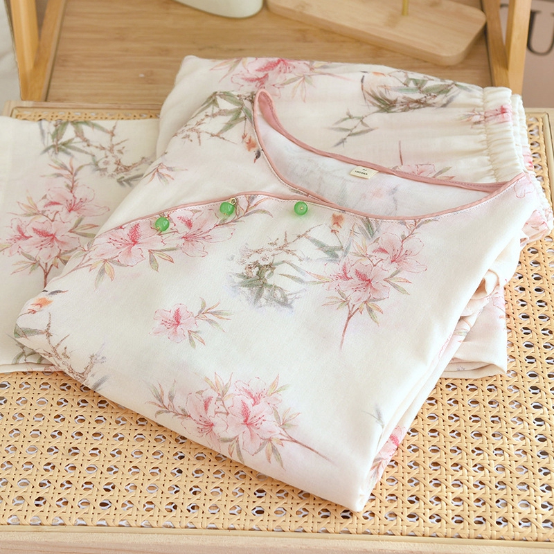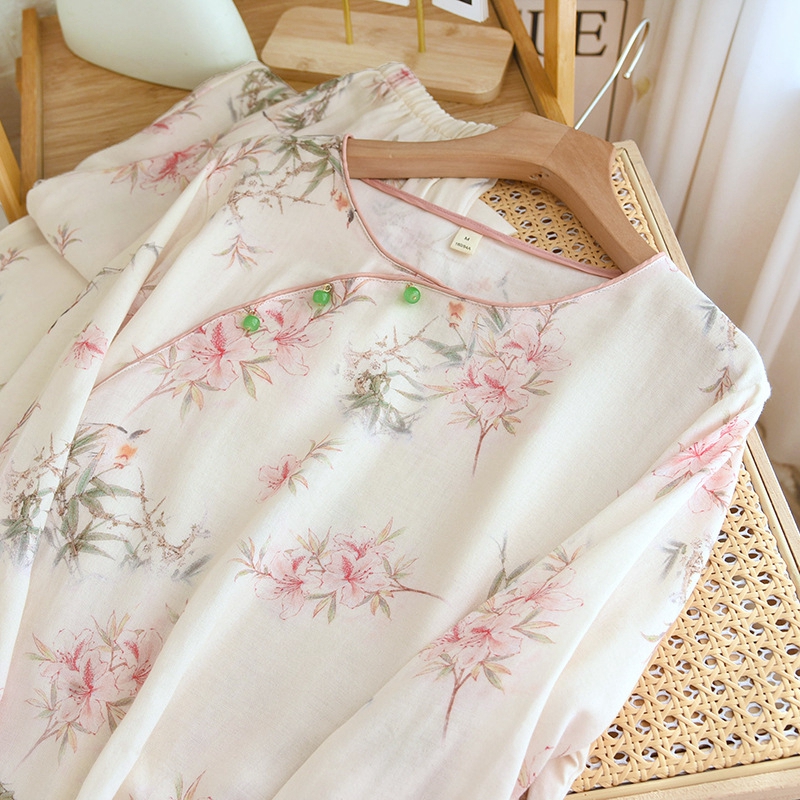商品名称:洛兰沙家居馆【只代发】【只代发】 2025新款国风竹纤维鸟语花香春夏女睡衣大码长袖长裤自带凉感休闲套装 ls1309