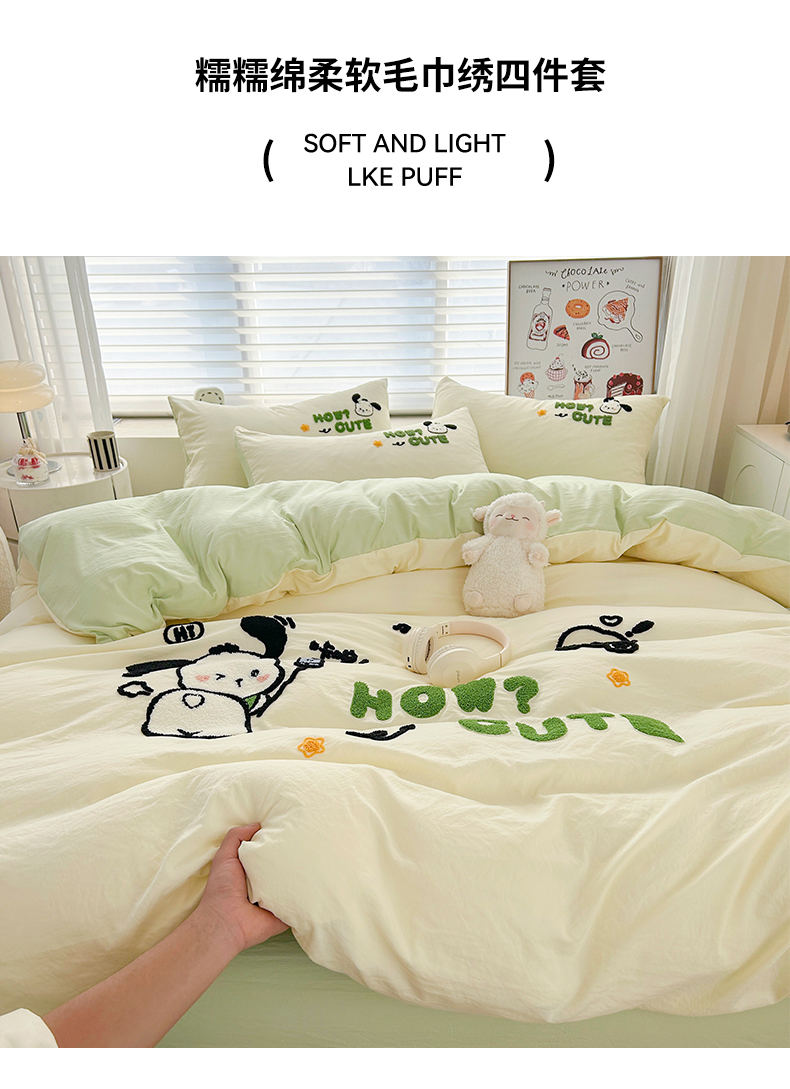 包小包 2025新款糯糯绵毛巾绣可爱卡通爆款四件套 顽皮狗-白绿