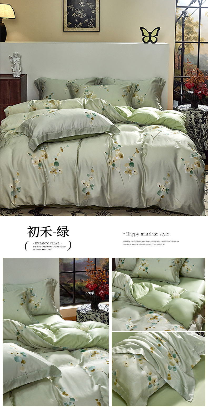 商品名称:未来家居 2025春夏新款100支莱赛尔天丝贡缎纯色印花系列高端礼盒四件套 初禾-绿