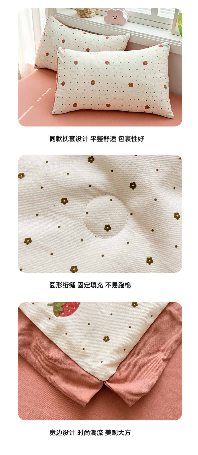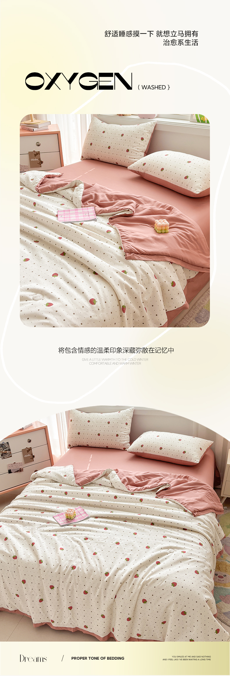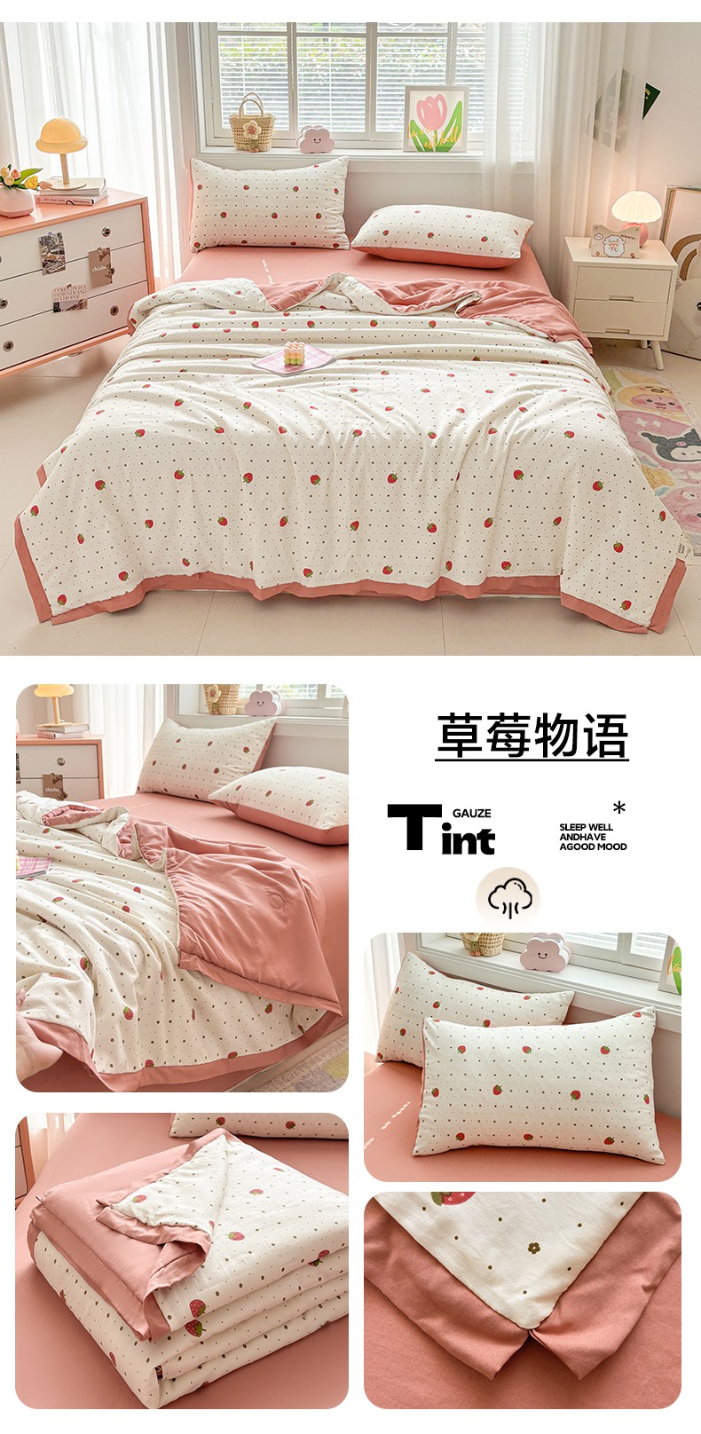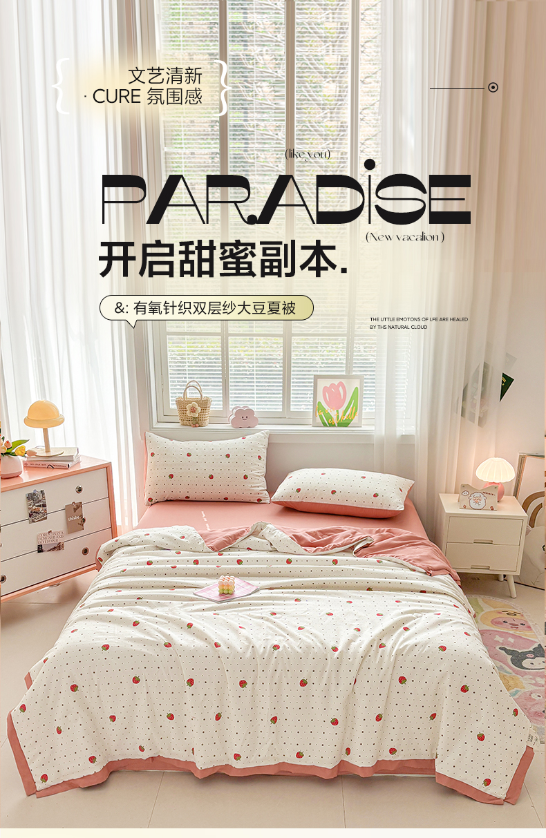 当前位置: 91家纺网 > 商品网购 > 床品套件 > 四件套 > 夏被四件套 > 金喜 2025新款小清新风格有氧针织双层纱大豆被夏被四件套 草莓物语