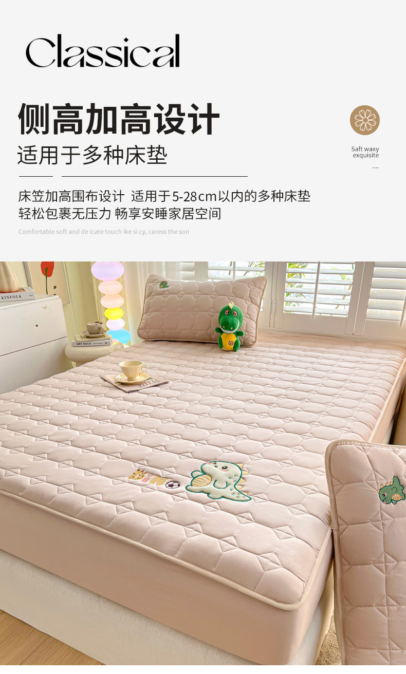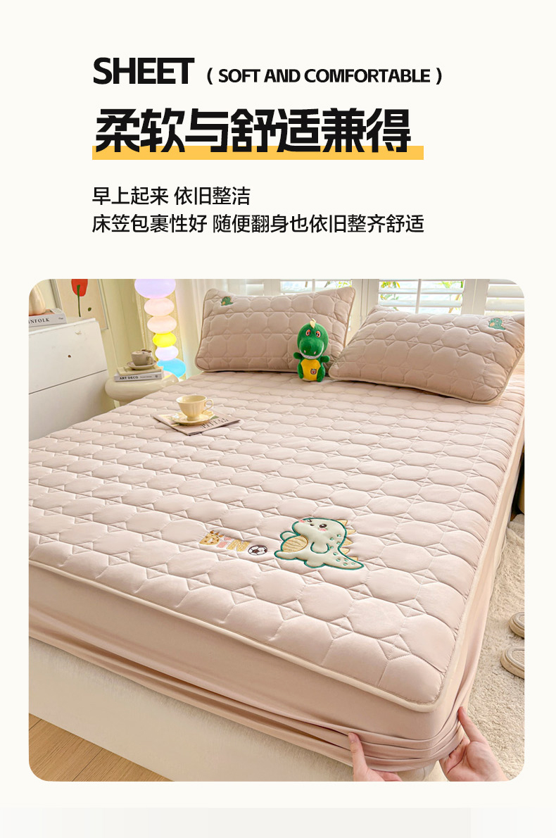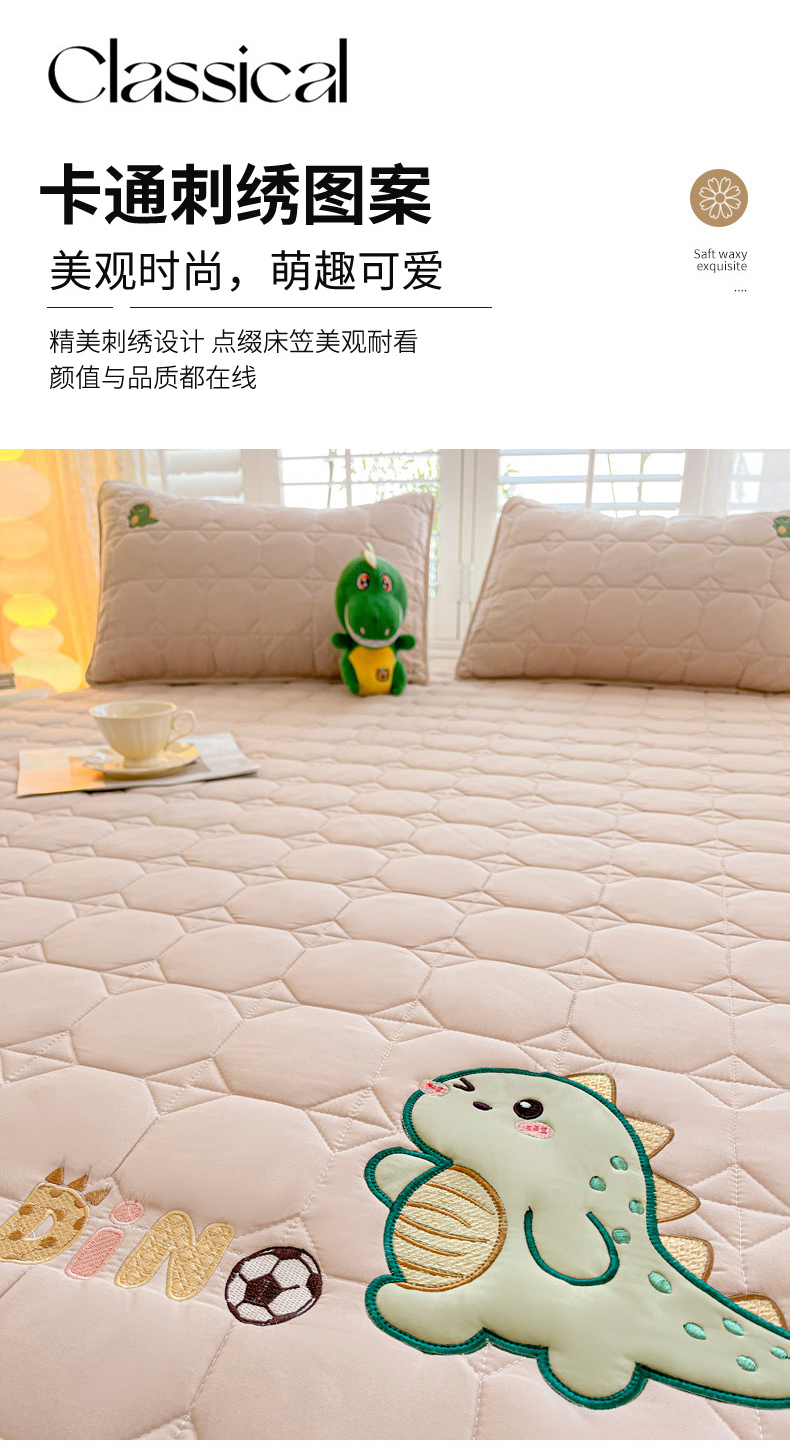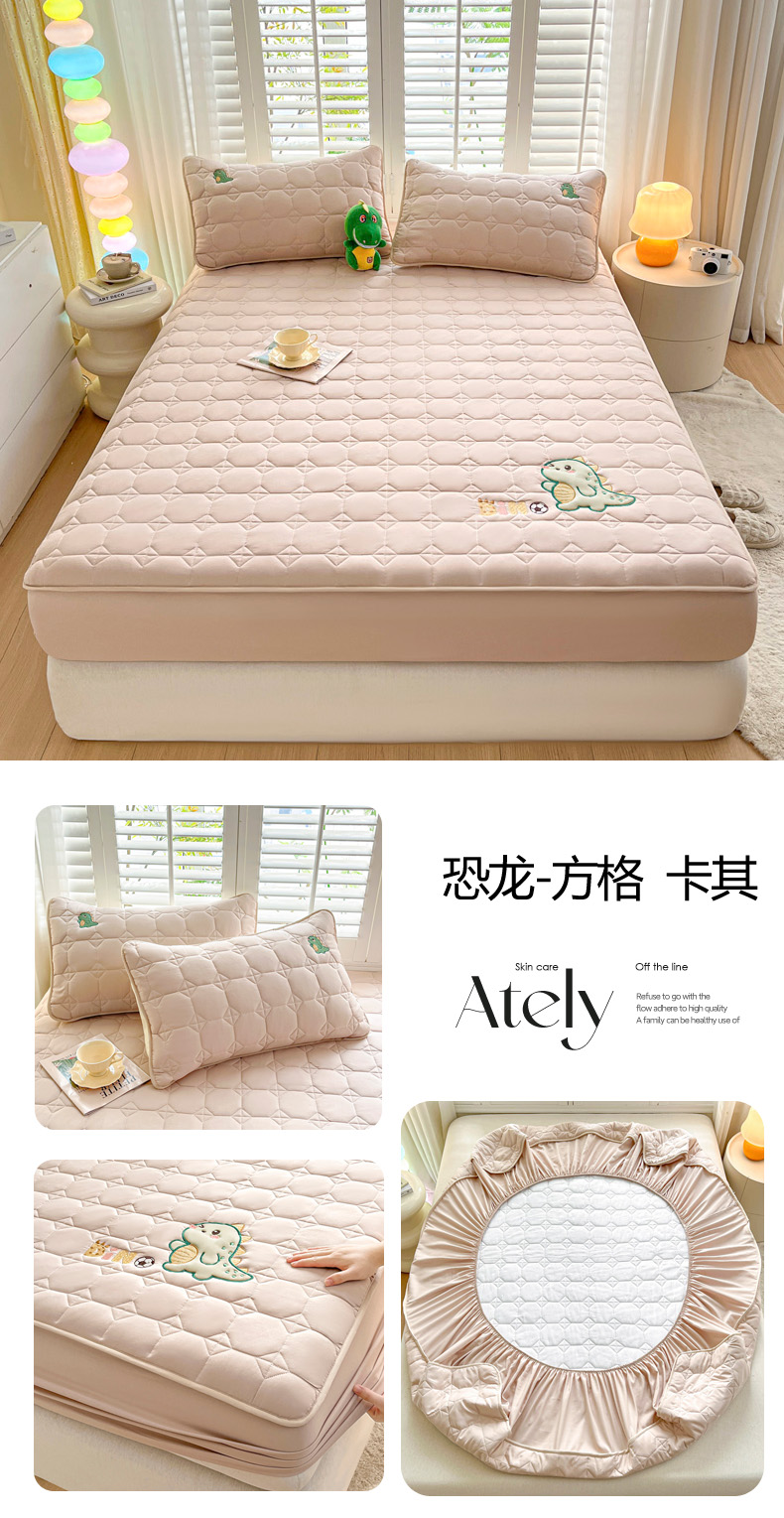 商品名称:万盛家纺 2025新款夹棉恐龙刺绣床笠 恐龙-方格 卡其