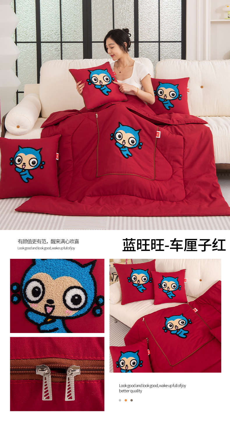 宝马家纺(原梦童画)2025新款毛巾绣阿狸四季款抱枕被 蓝旺旺-车厘子红