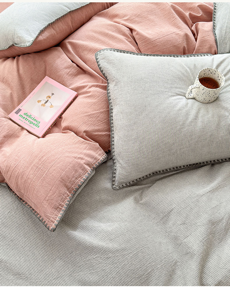 当前位置: 91家纺网 > 商品网购 > 床品套件 > 四件套 > 全棉普通四件套 > 晚依家纺 2025新款A类全棉色织水洗棉被套单件格子条纹四件套学生宿舍被罩三件套定制定做 时光-灰豆沙