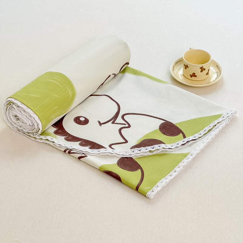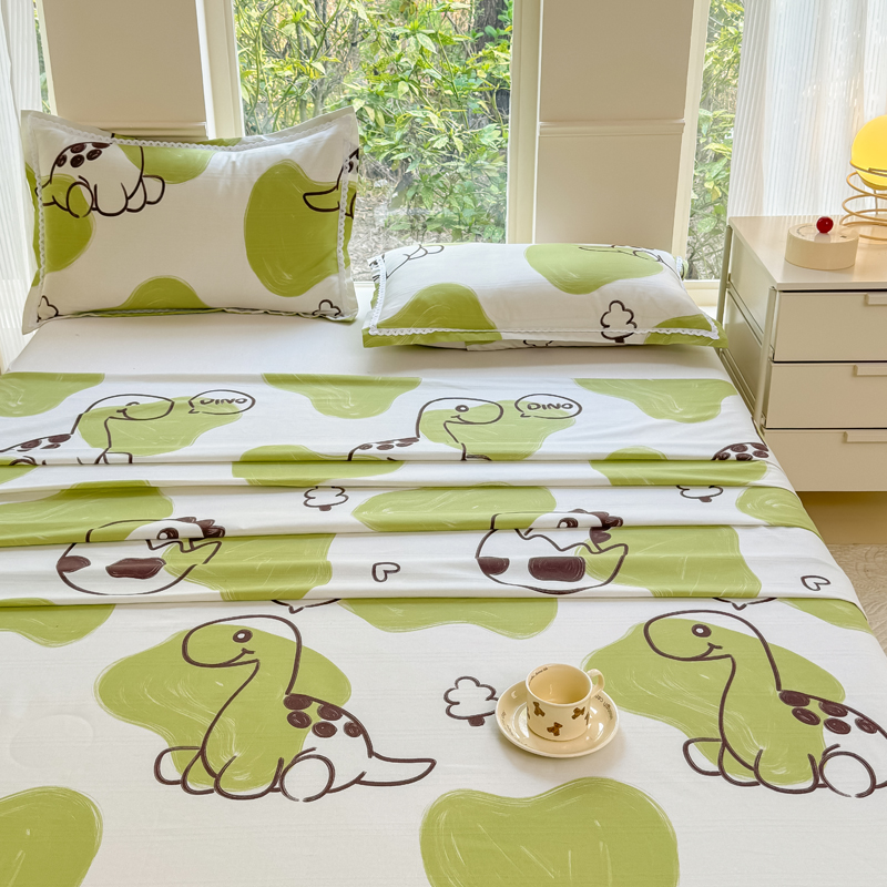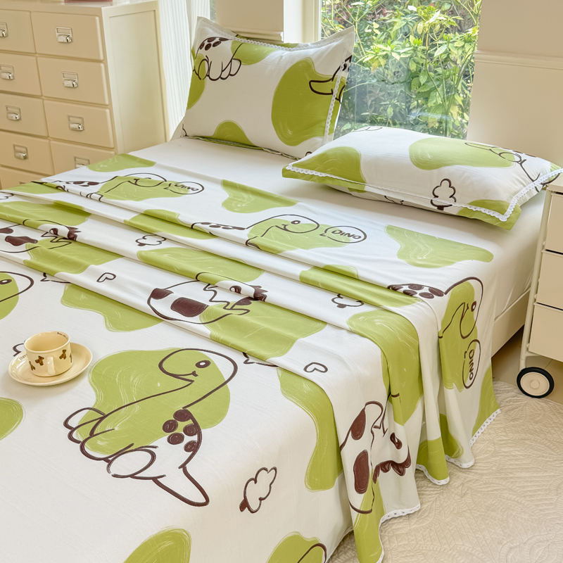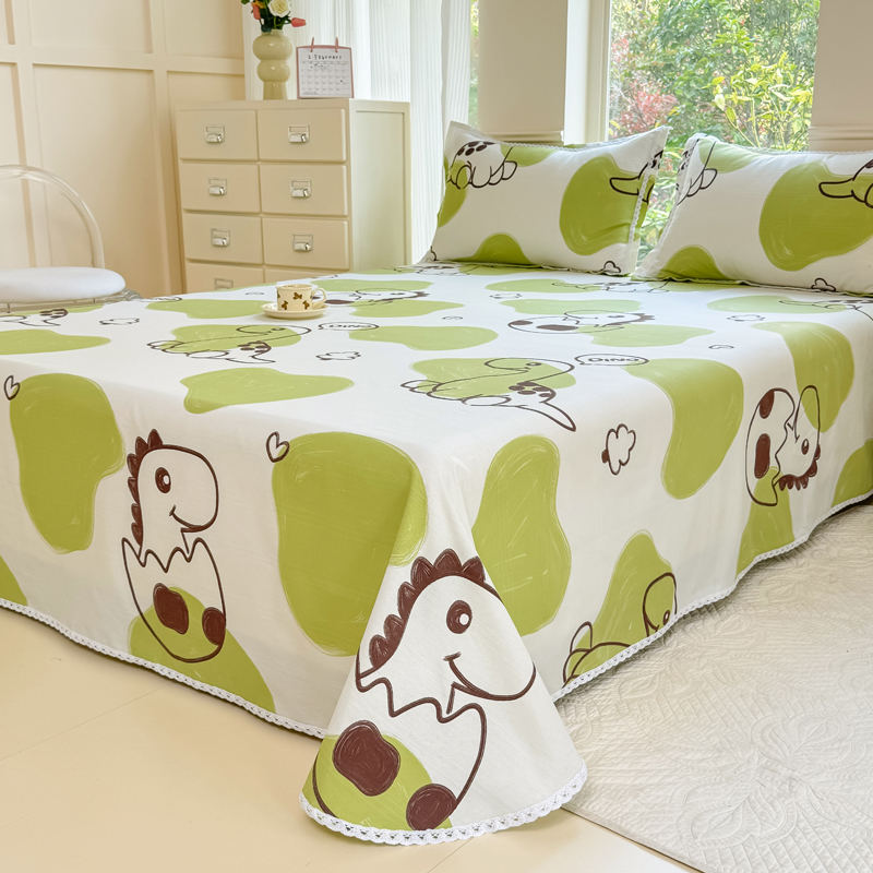 宜家坊 2025新款春夏原棉鱼骨棉老粗布花边印花床单软凉席三件套 绿影萌龙