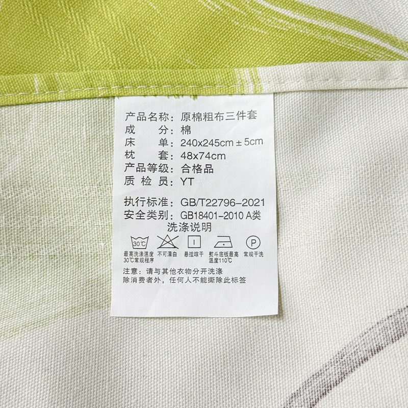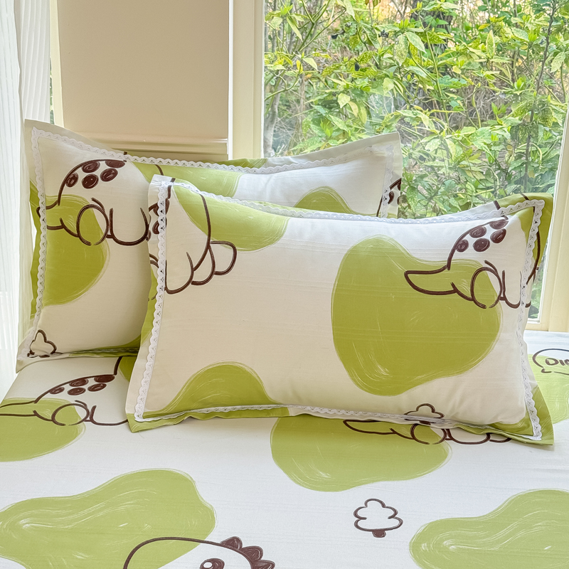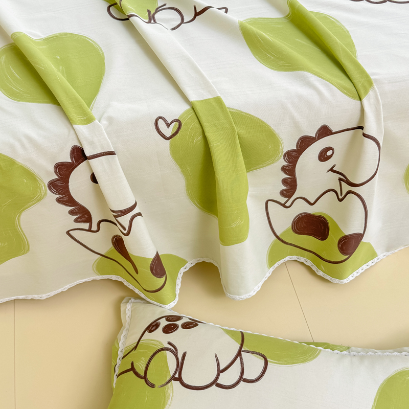 商品名称:宜家坊 2025新款春夏原棉鱼骨棉老粗布花边印花床单软凉席三件套 绿影萌龙