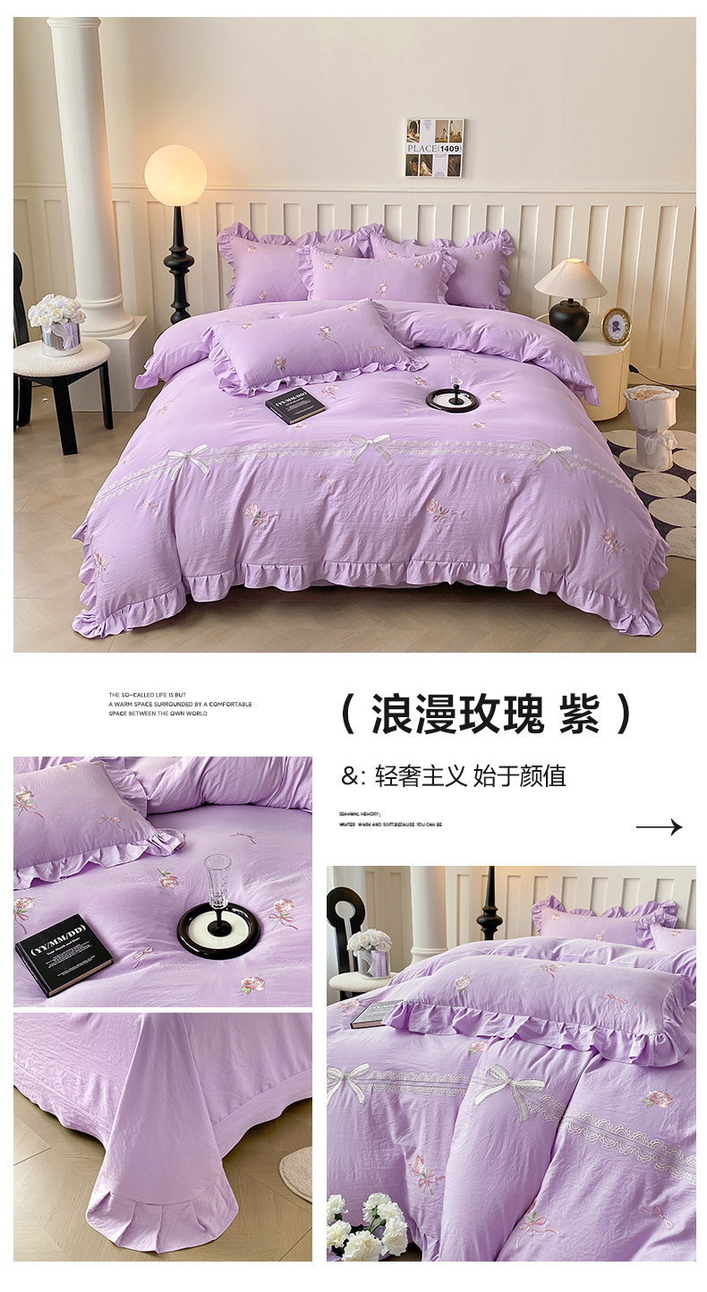 商品名称:大麦乐田 2025爆款韩版法式 满版刺绣大宽花边吊边款四件套 浪漫玫瑰 紫
