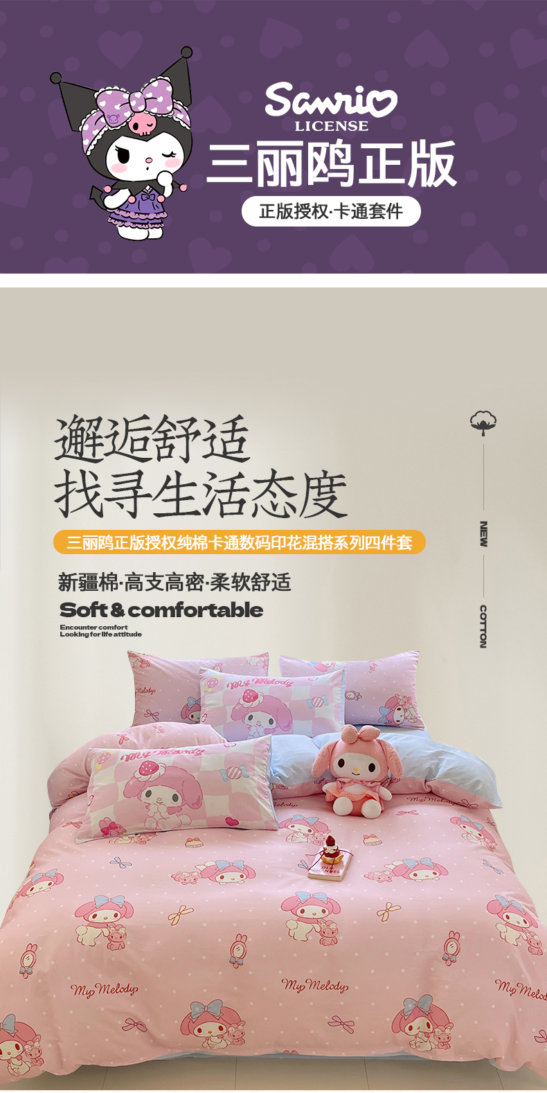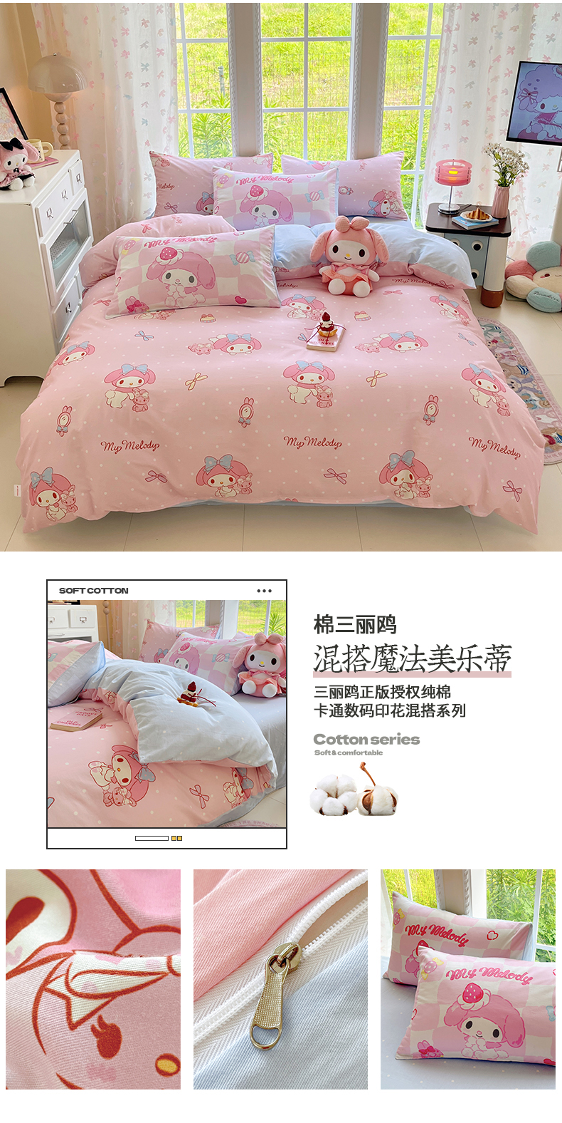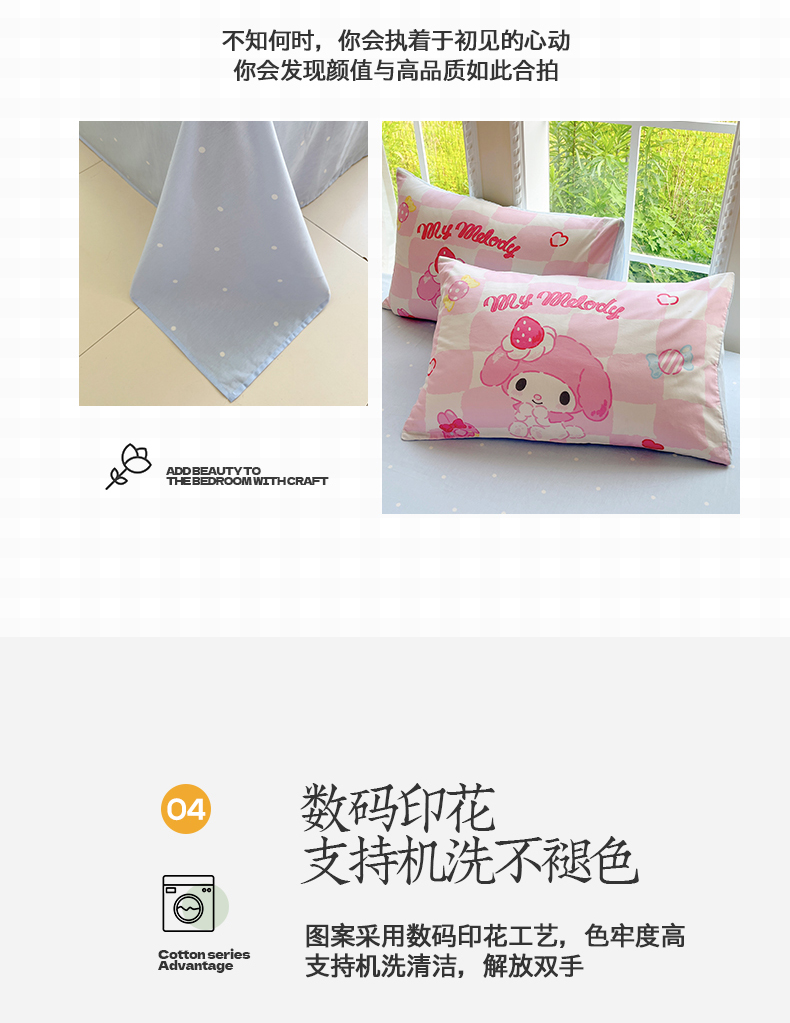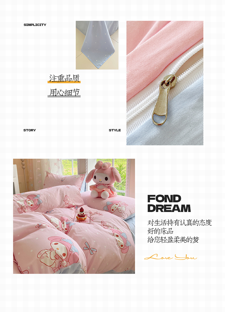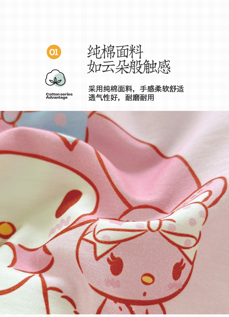 当前位置: 91家纺网 > 商品网购 > 床品套件 > 四件套 > 全棉普通四件套 > 金爱家2025新款三丽鸥正版授权卡通数码印花混搭纯棉印花系列四件套 棉三丽鸥-混搭魔法美乐蒂