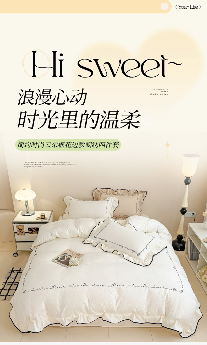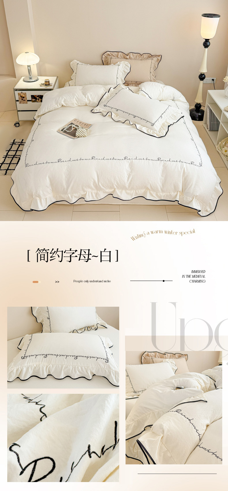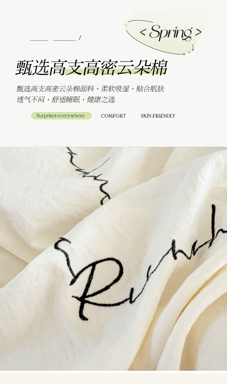 当前位置: 91家纺网 > 商品网购 > 床品套件 > 四件套 > 其它四件套 > 米可 2025新款云朵棉刺绣花边款四件套 简约字母-白