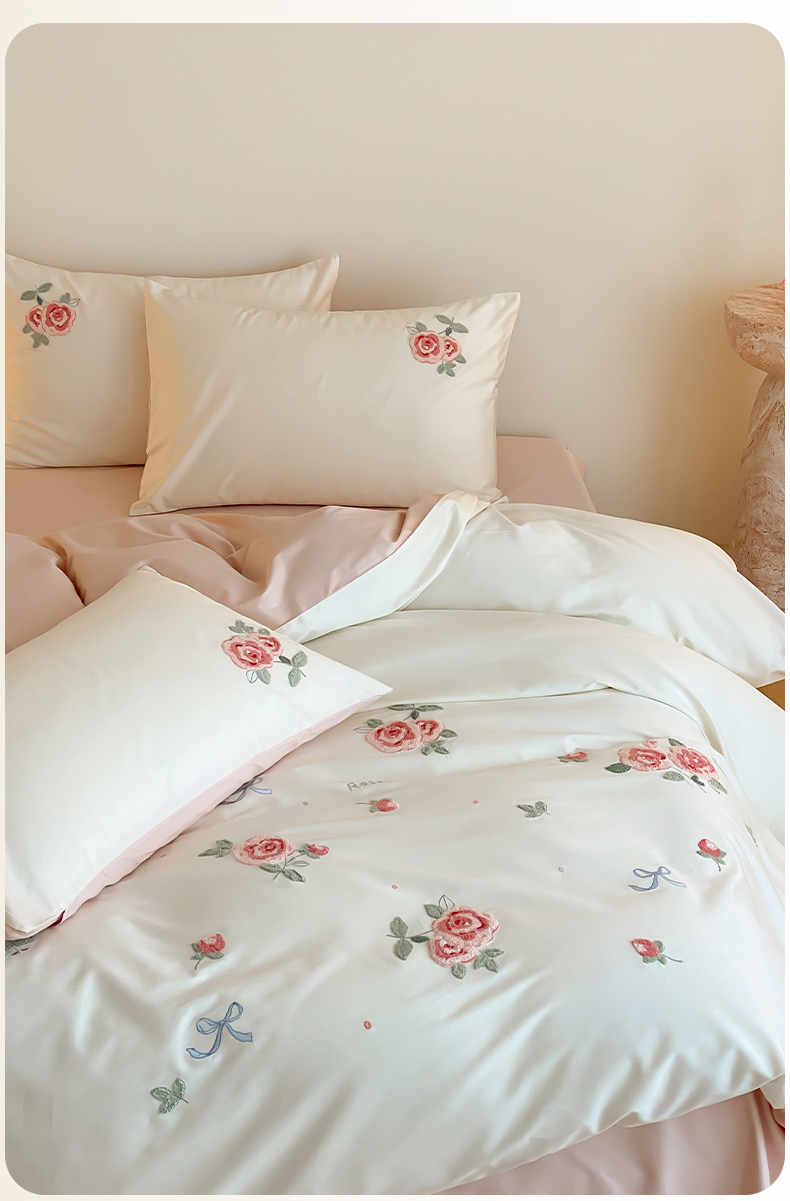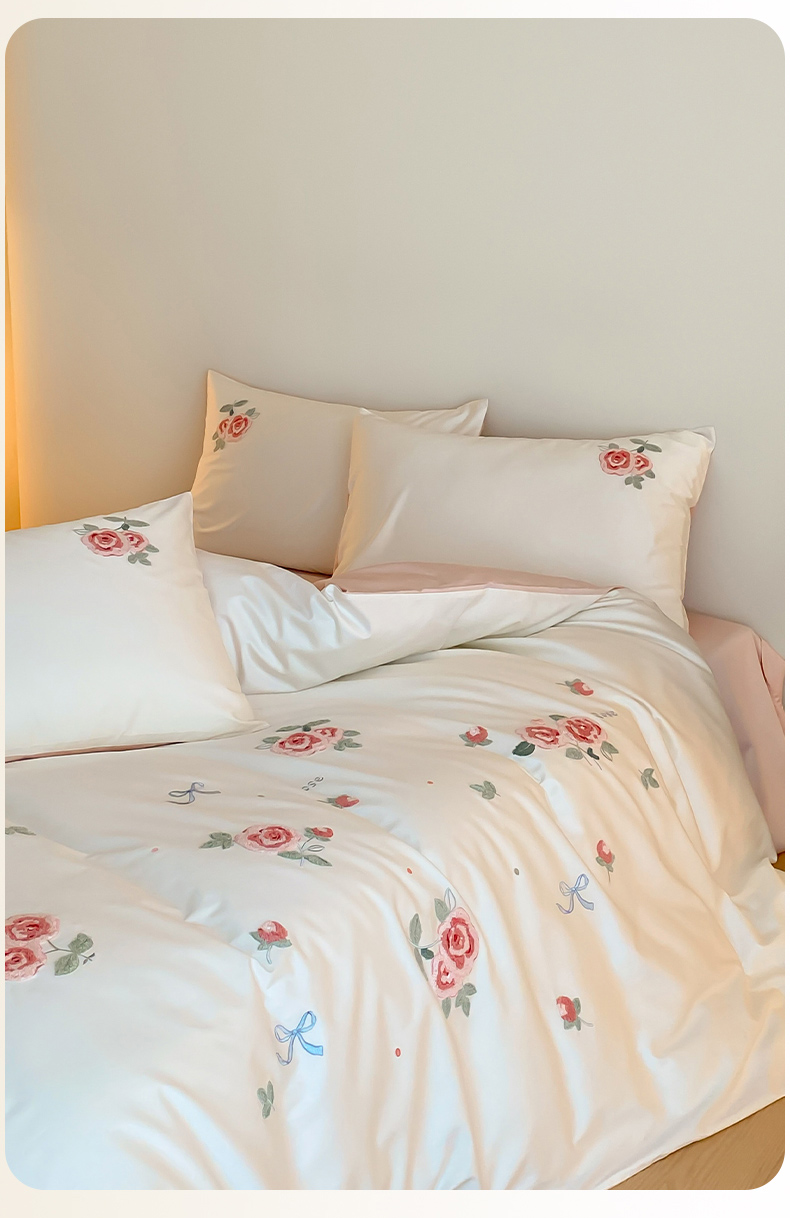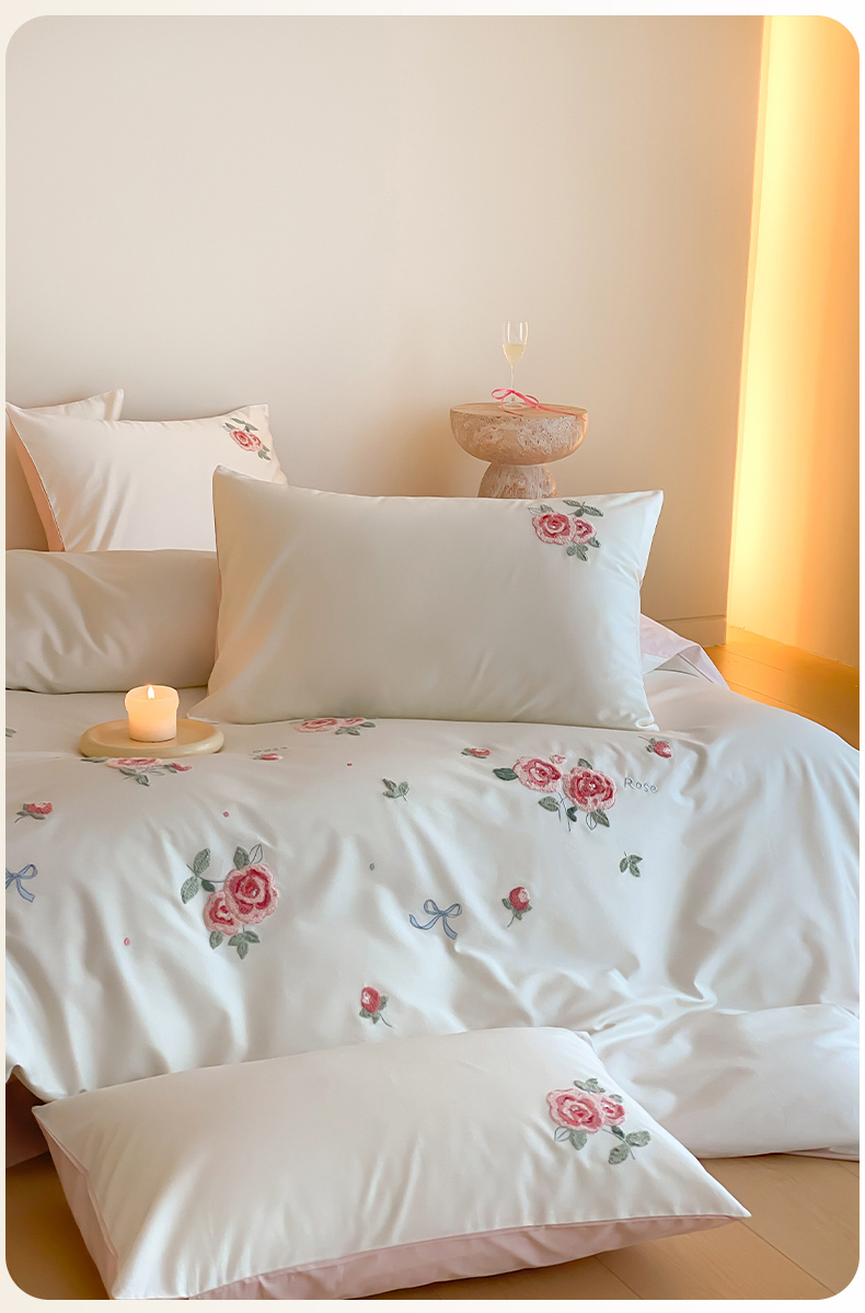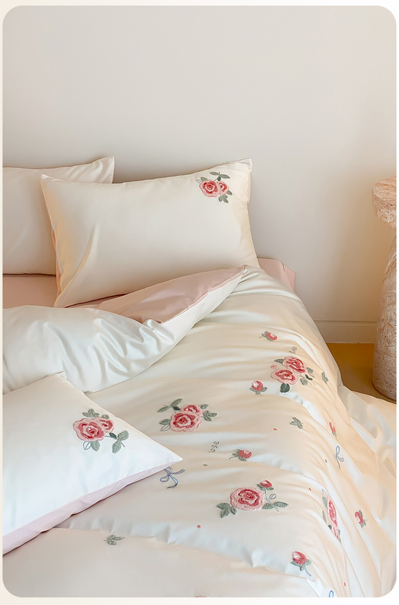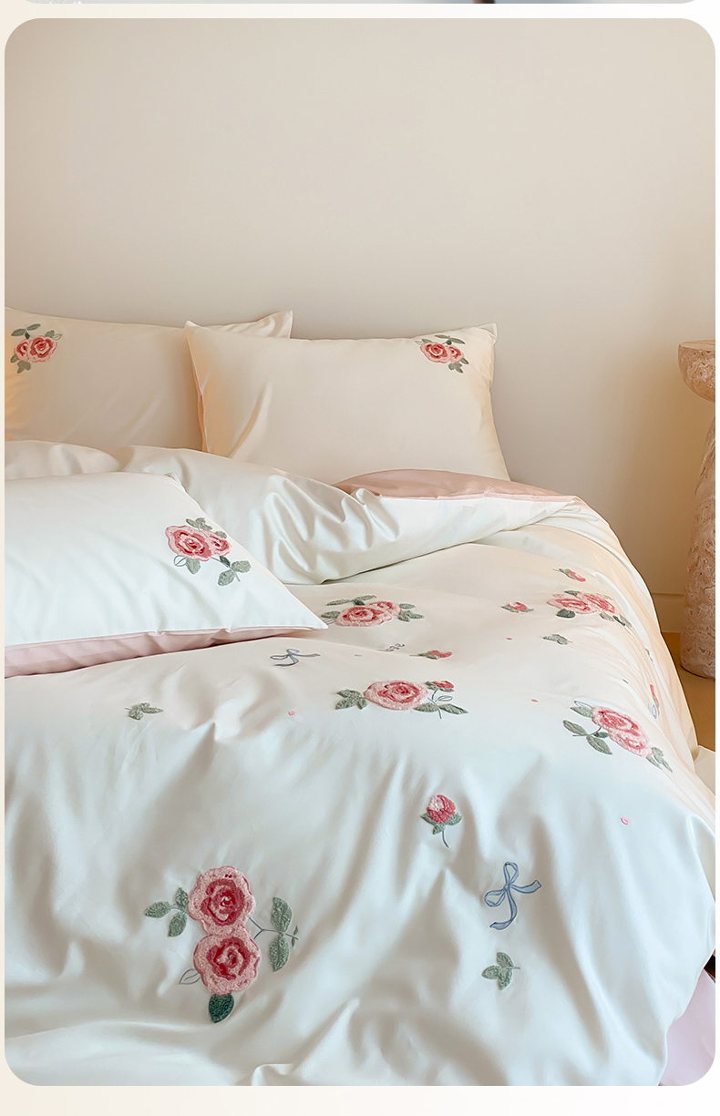 云栖2025全棉刺绣纯色纯棉长绒棉四件套-乐萌系列 香馥玫瑰