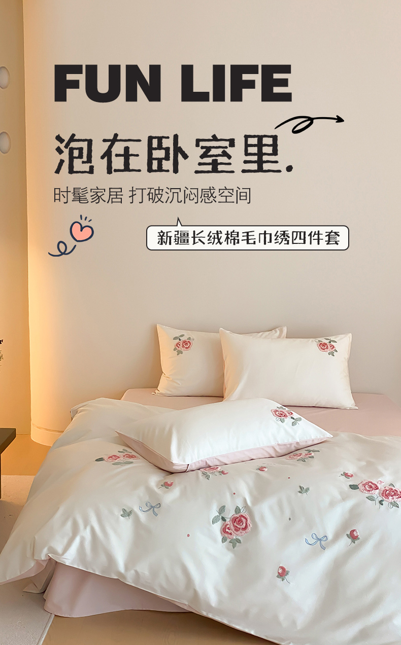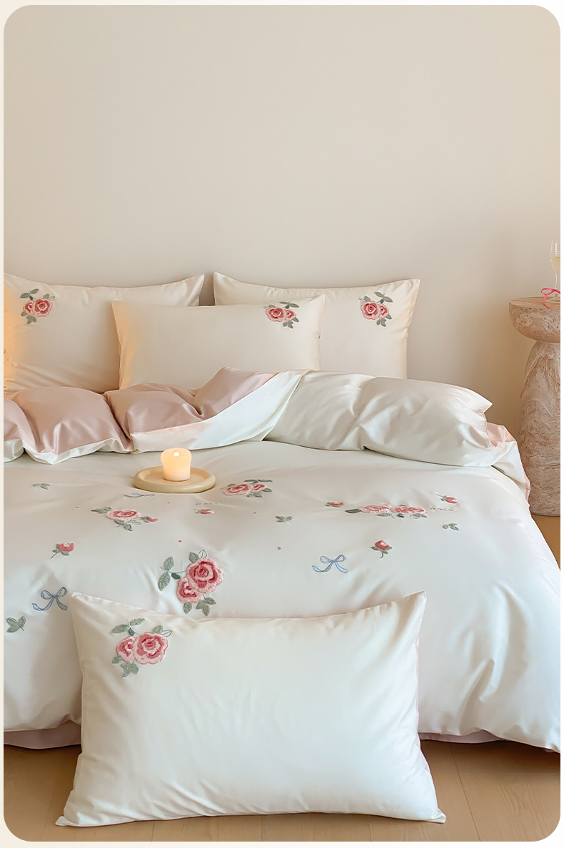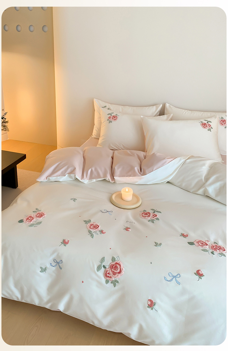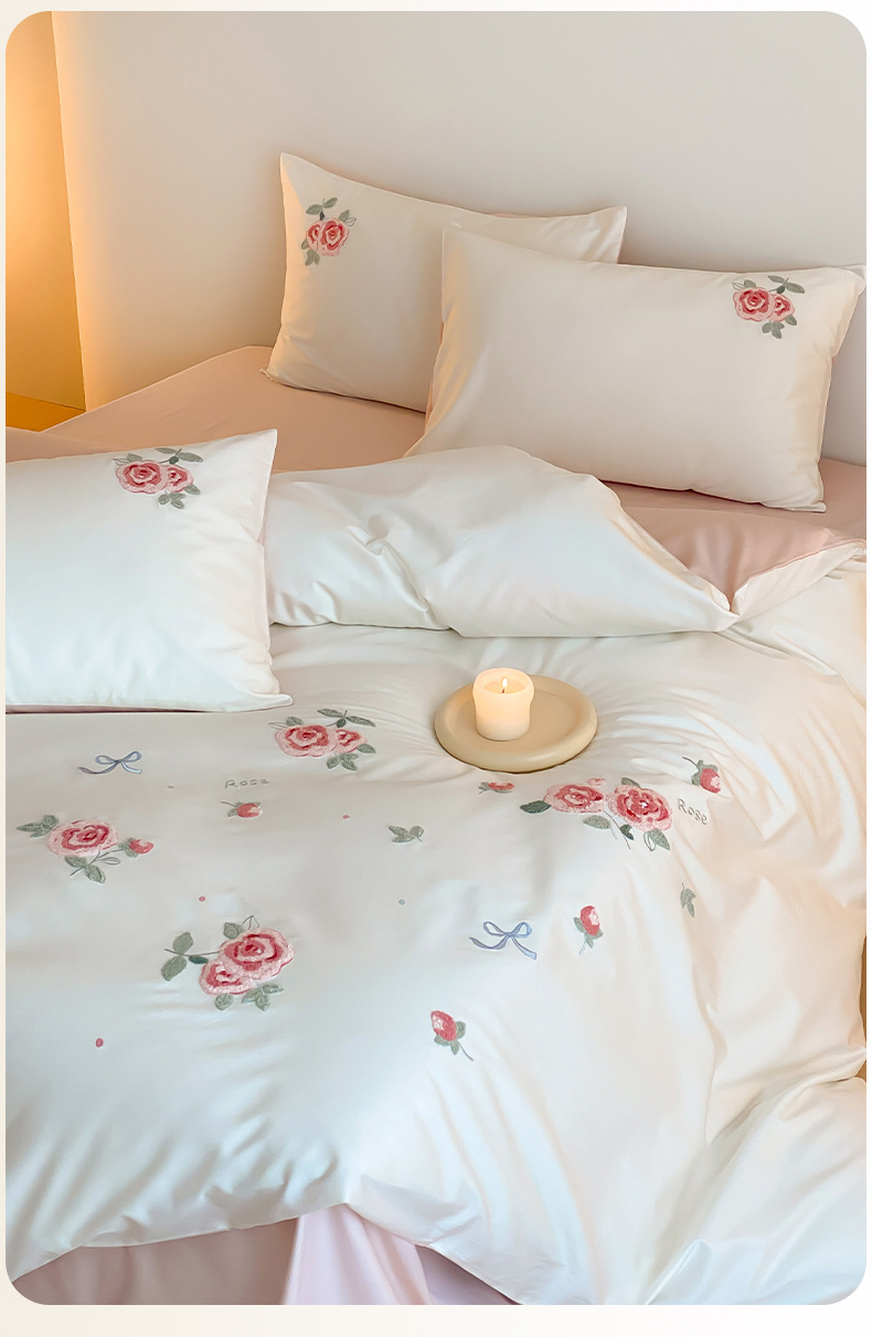 云栖2025全棉刺绣纯色纯棉长绒棉四件套-乐萌系列 香馥玫瑰