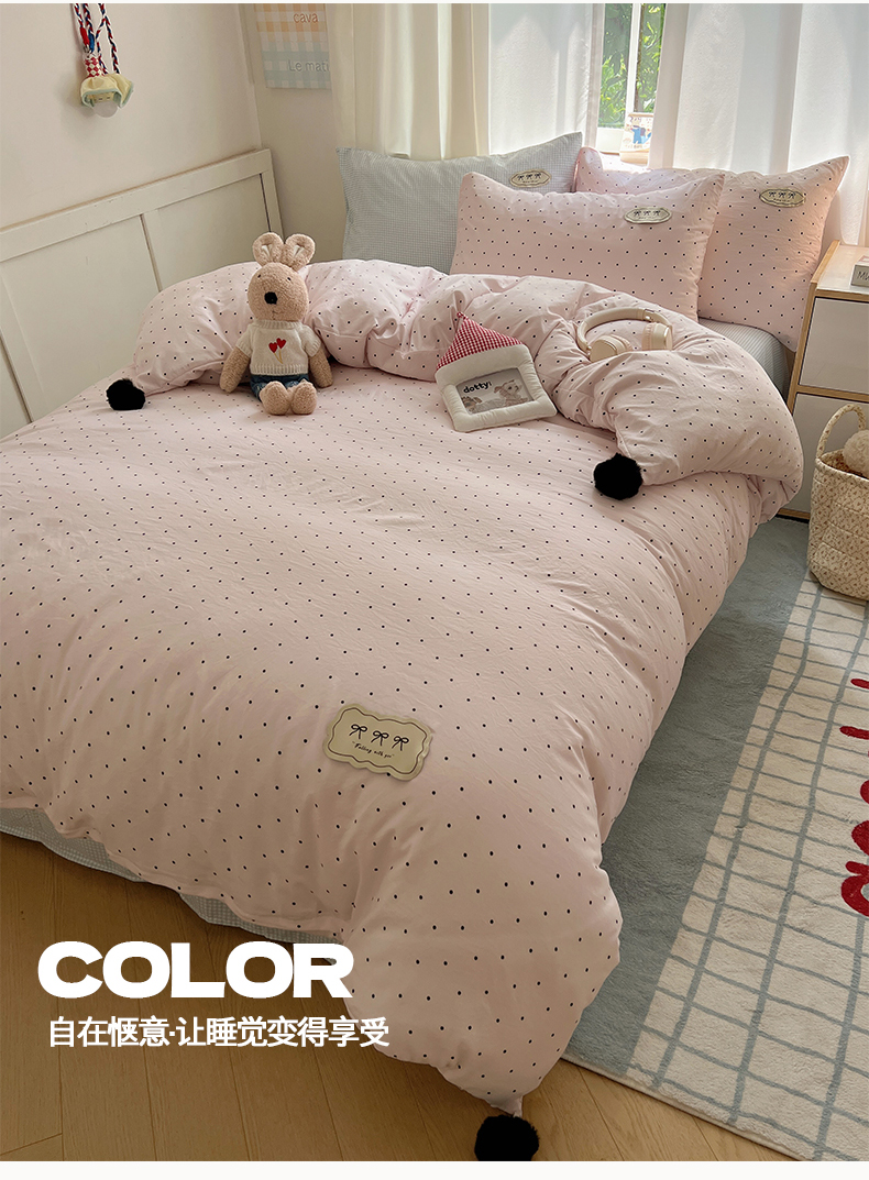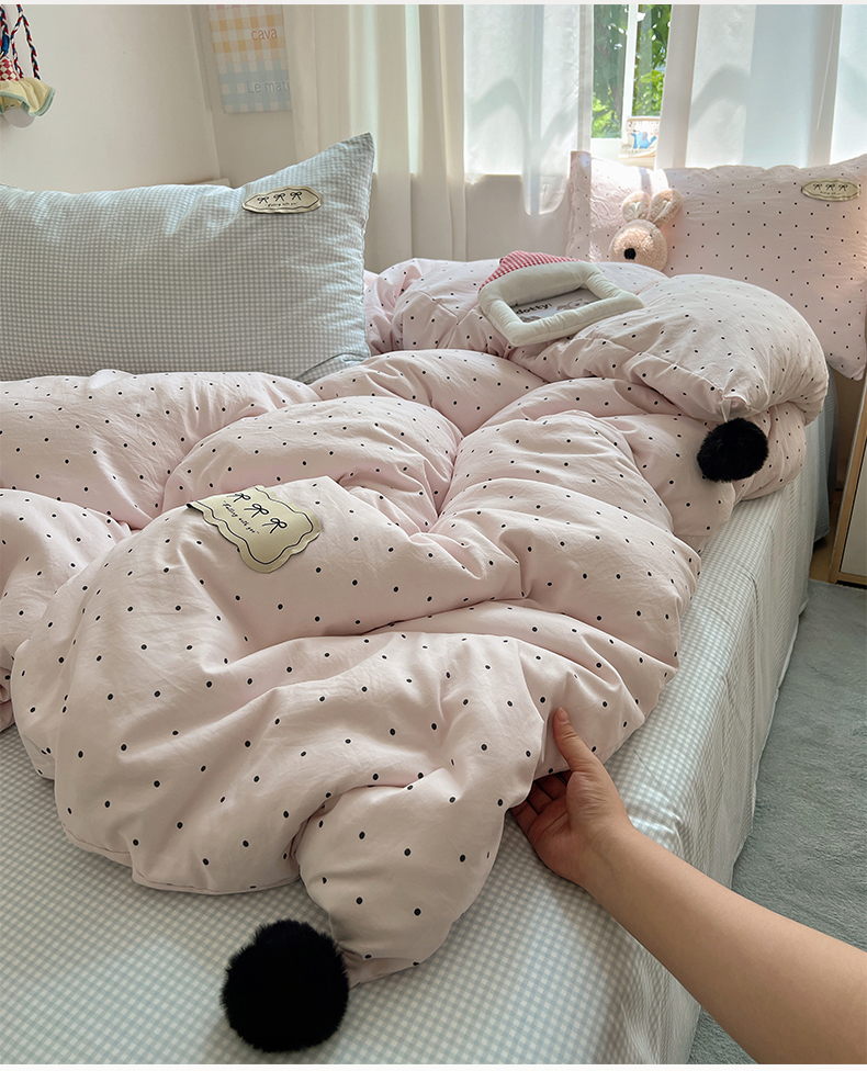当前位置: 91家纺网 > 商品网购 > 床品套件 > 四件套 > 全棉普通四件套 > 桃心家居 2025新款A类ins云柔水洗棉织标混搭蝴蝶结毛球少女奶呼呼仙气四件套系列 水洗棉毛球-蝴蝶结奶昔粉蓝