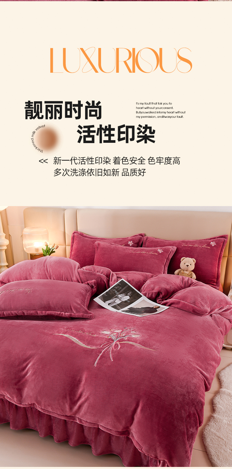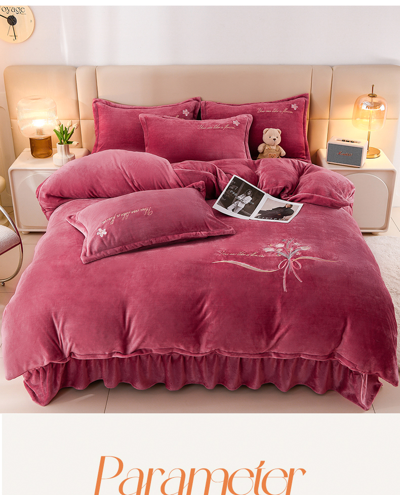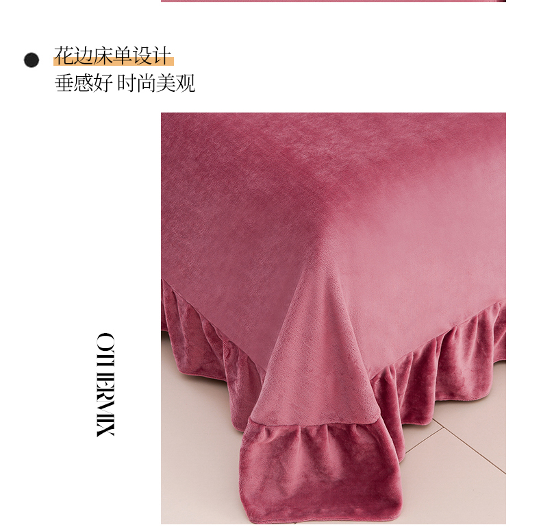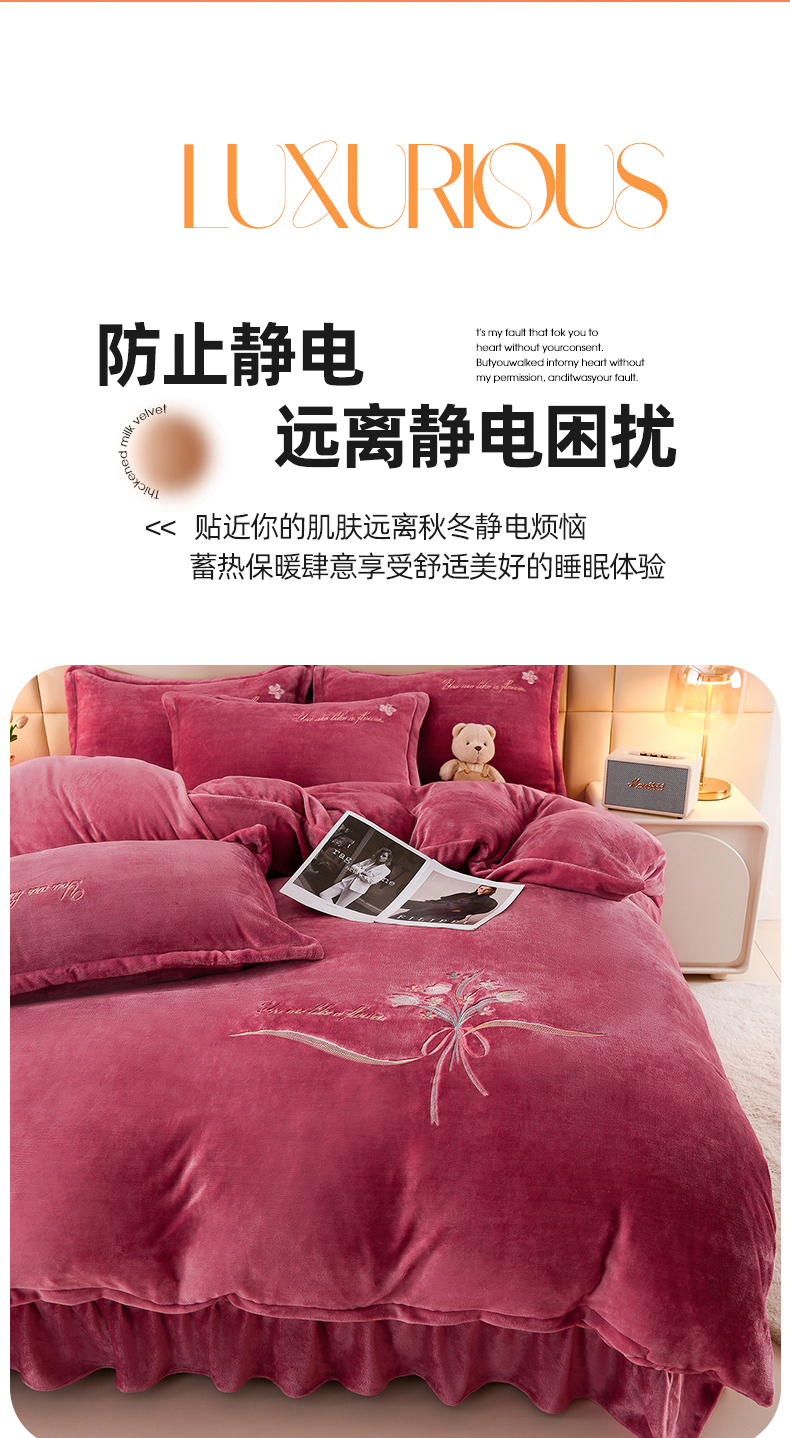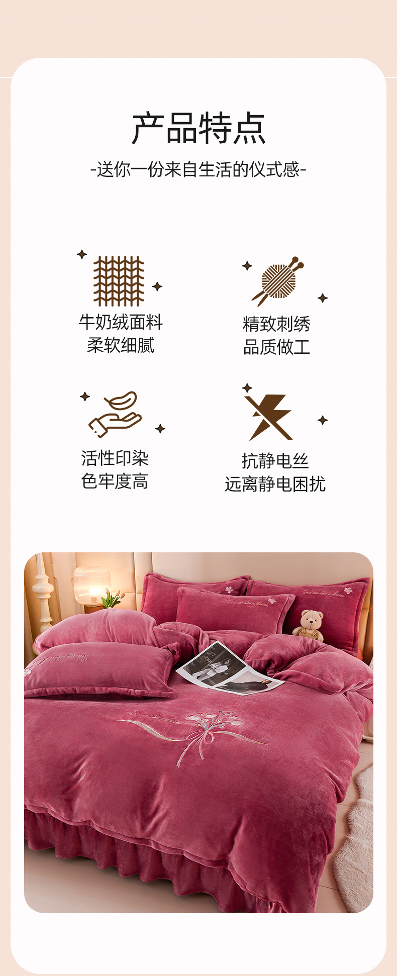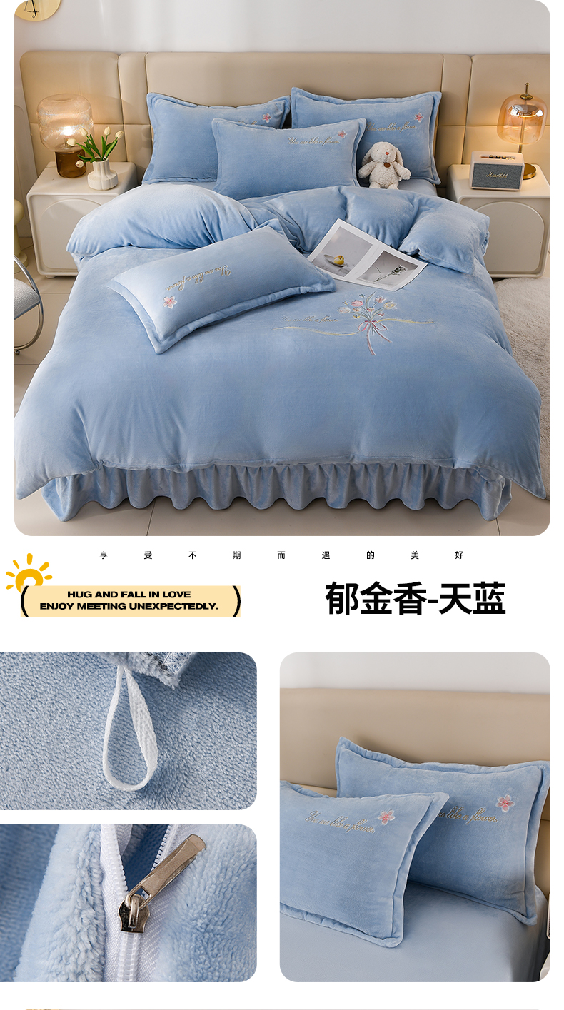 (总)绣女坊2023新款韩版花边床裙款牛奶绒宝宝绒四件套,宾利蓝,豆沙,灰色,酒红色,松花绿,紫色