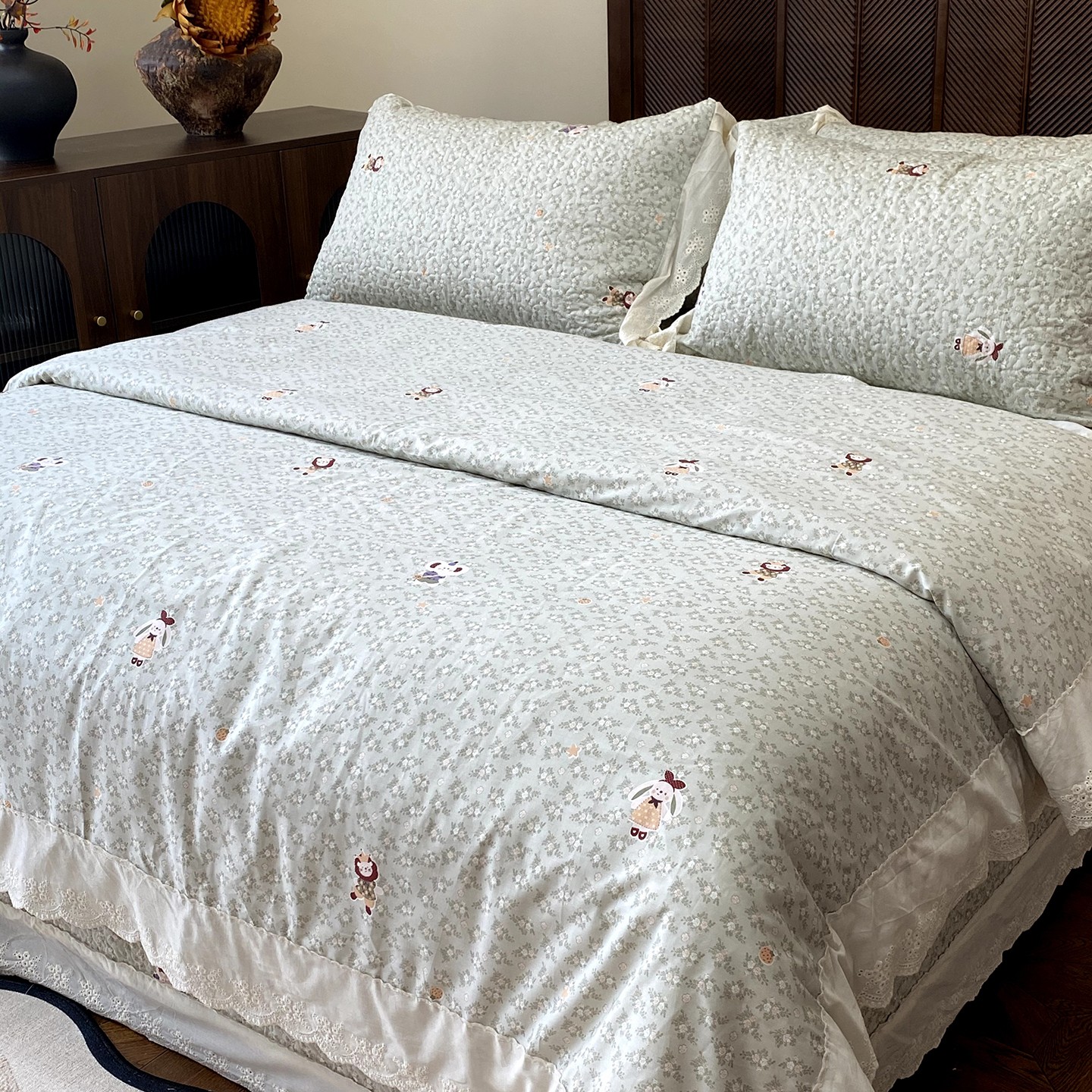 (总)奈萝家纺 2025新款全棉蕾丝花边床盖三件套四件套纯棉花边夏被,呆呆熊,花语绿,花语紫,柠檬,蔷薇,西瓜兔,夏蓝,夏梦,夏之语,小花熊,樱花
