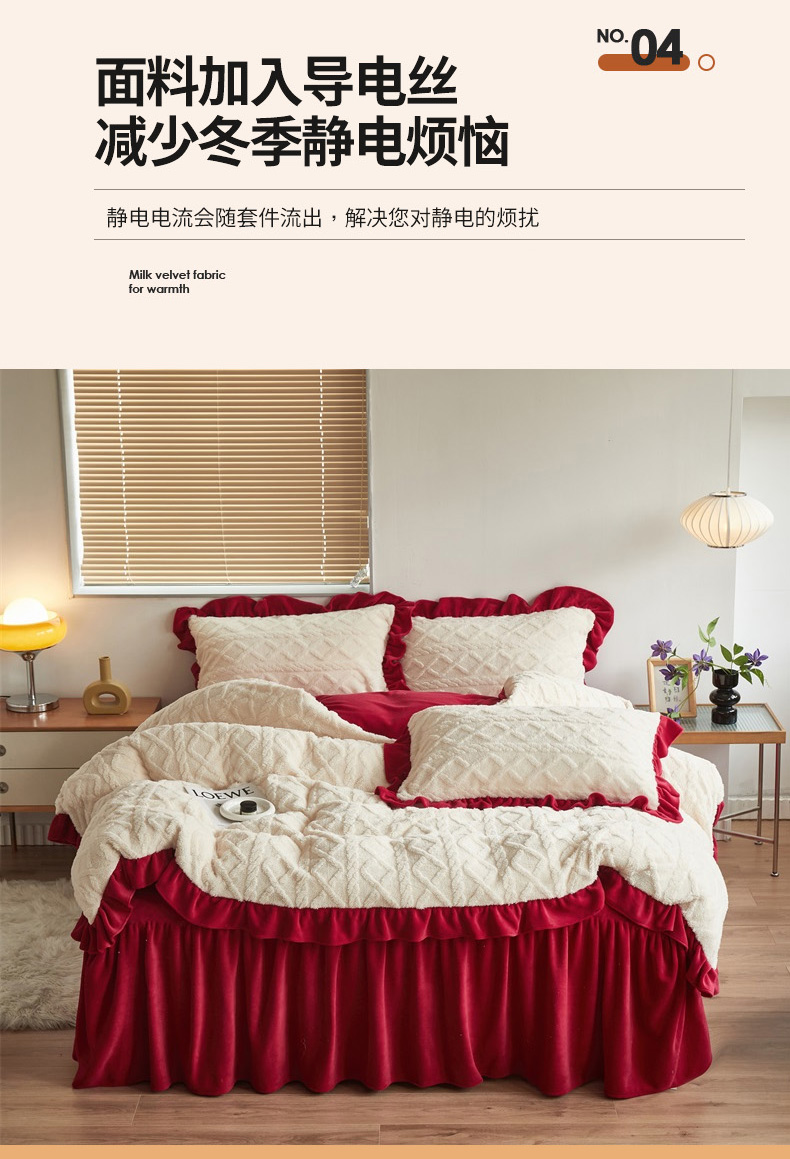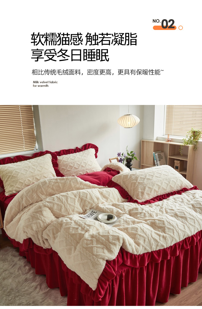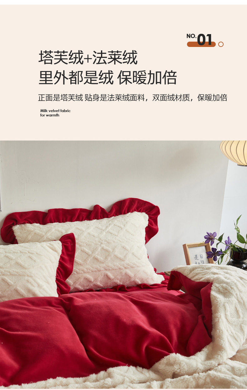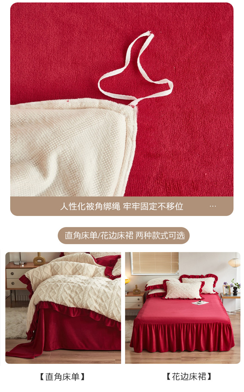 当前位置: 91家纺网 > 商品网购 > 床品套件 > 四件套 > 牛奶绒四件套 > 睡美人 2025新款韩版塔芙绒牛奶绒床单床裙床笠款四件套 依情白+大红色