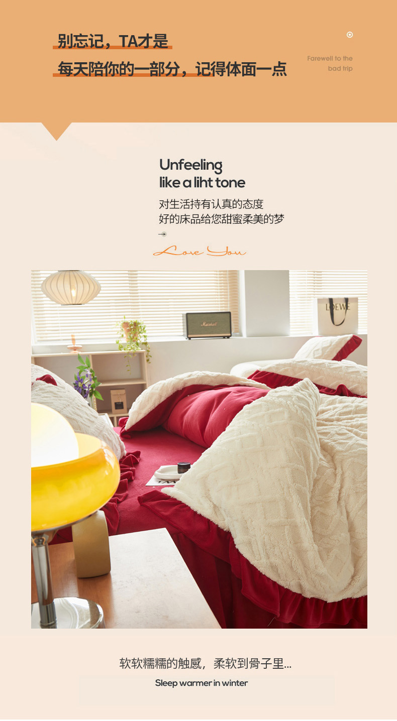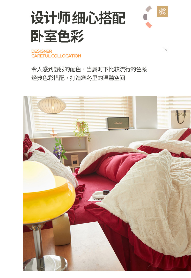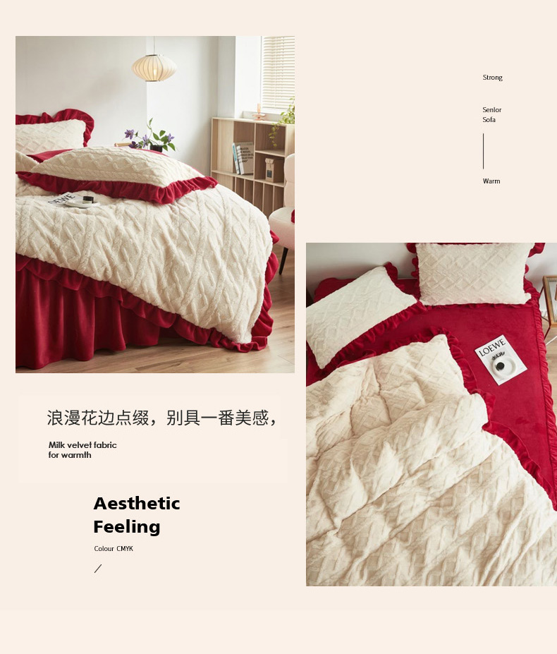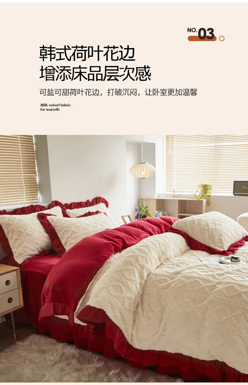 当前位置: 91家纺网 > 商品网购 > 床品套件 > 四件套 > 牛奶绒四件套 > 睡美人 2025新款韩版塔芙绒牛奶绒床单床裙床笠款四件套 依情白+大红色