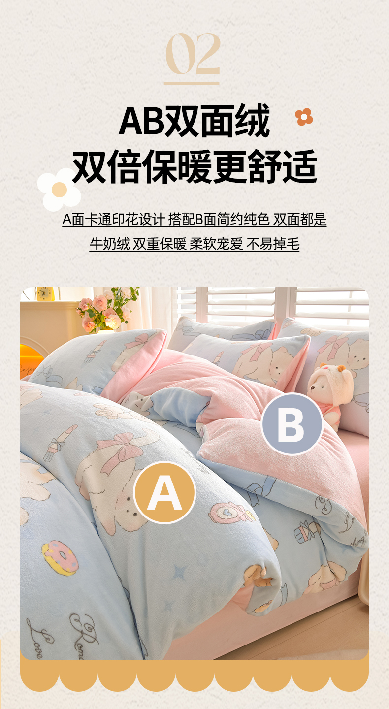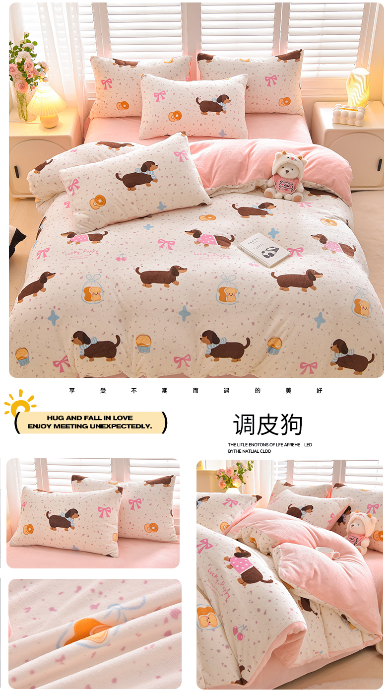 鑫喜莱家纺 2025新款加厚牛奶绒卡通印花四件套 宠物日记