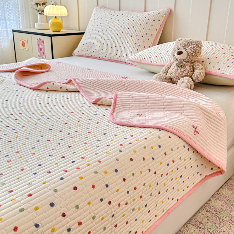 (总)岚吉家纺 2025新款全棉绗缝棉花床盖花边款三件套四件套,缤纷樱桃,草莓格子,花边兔,黄苏条,蓝美人,落落晨光,萌萌狮,蘑菇狗,秋日玫瑰,兔菲菲,向晚,小黑点点(米),游花间