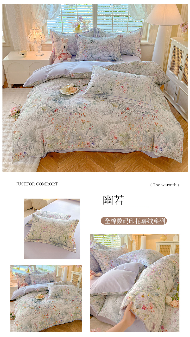 当前位置: 91家纺网 > 商品网购 > 床品套件 > 四件套 > 全棉普通四件套 > 巧玲珑 2025新款100%数码印花生态AB版四件套 幽若
