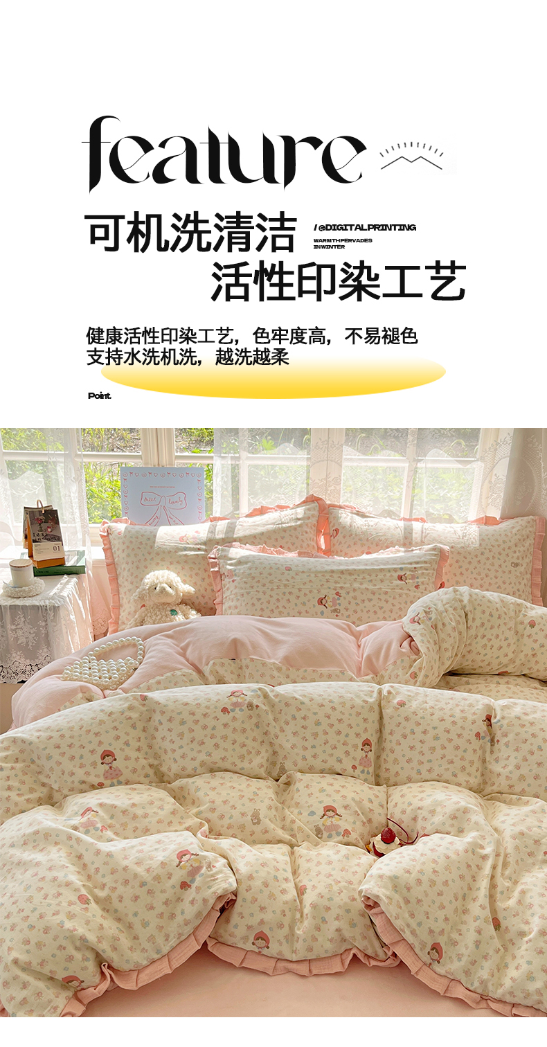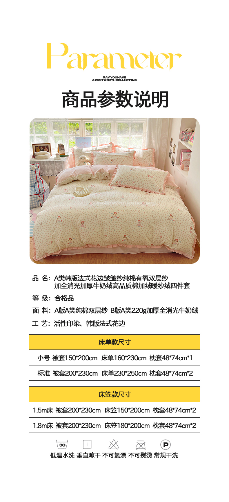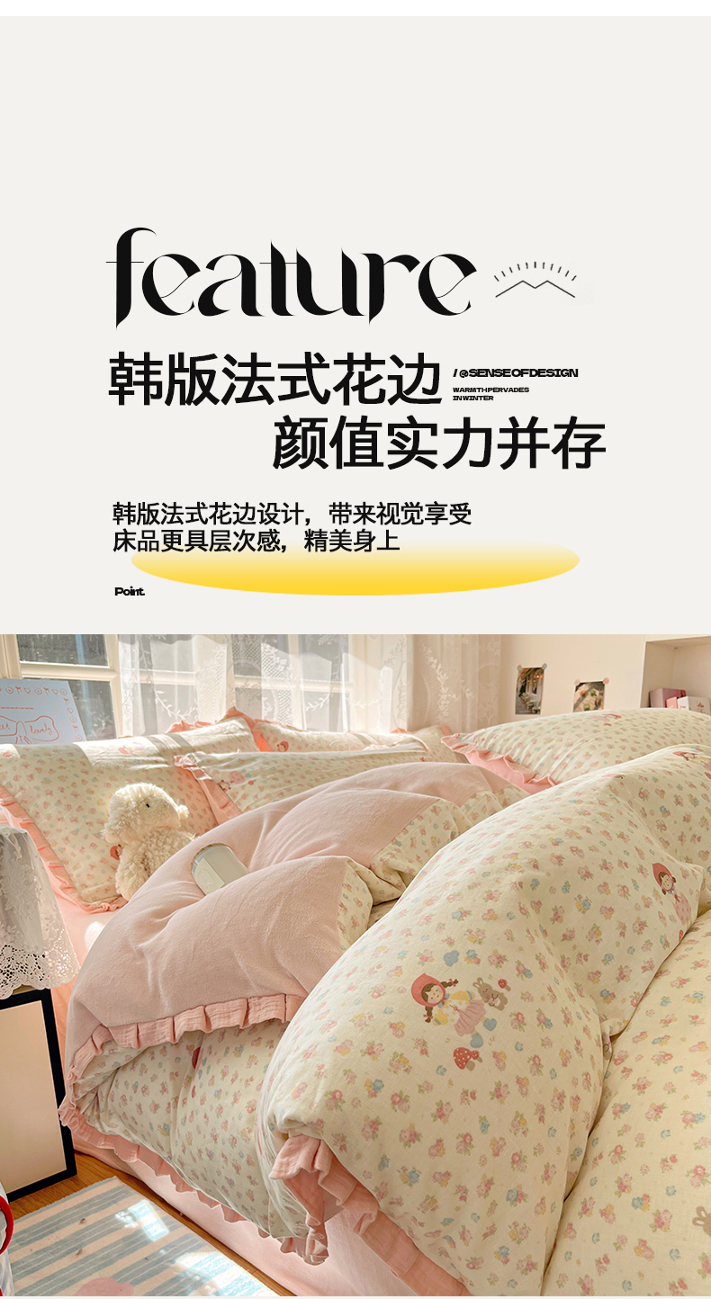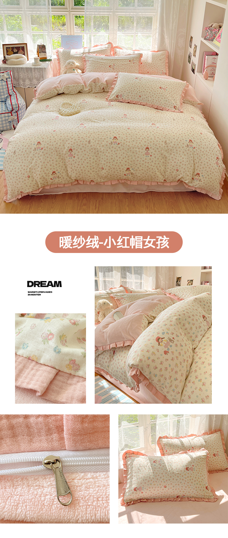 商品名称:桃子家居 2025新款A类韩版花边皱皱纱纯棉有氧双层纱加全消光加厚牛奶绒高品质棉加绒暖纱绒四件套 暖纱绒-小红帽女孩