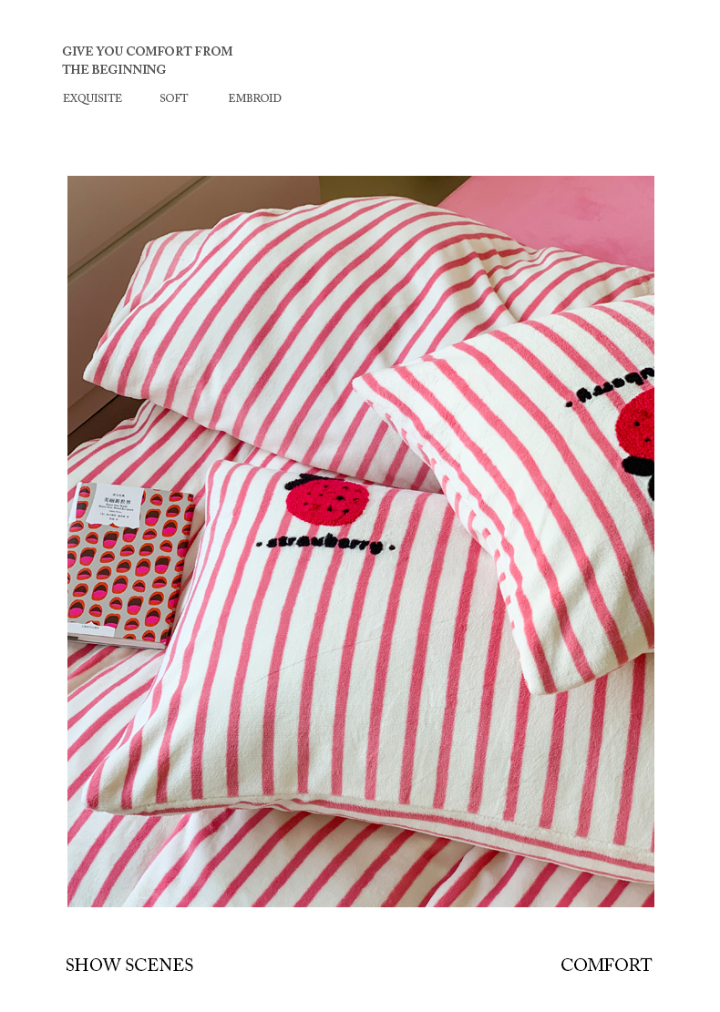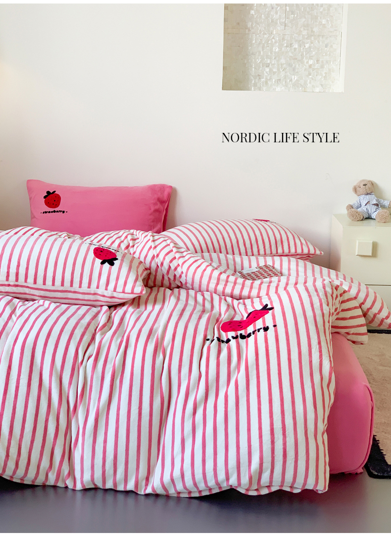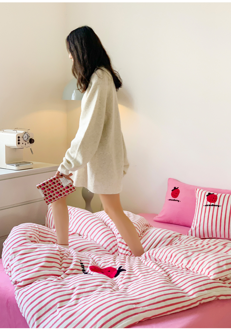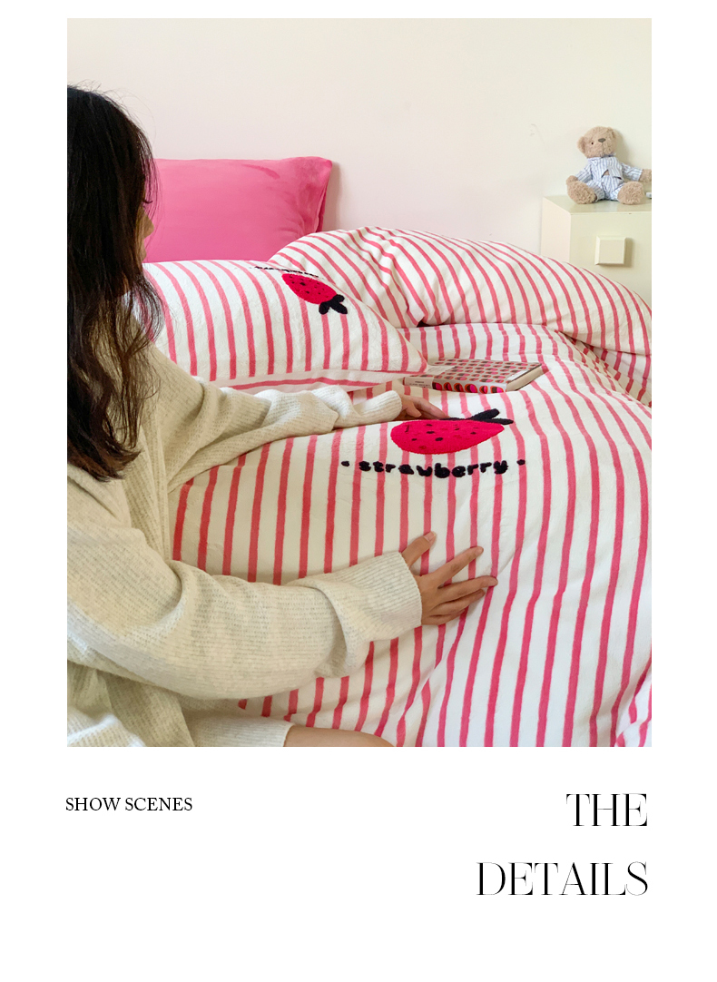 商品名称:慕晨 2025简奢新款高克重牛奶绒卡通绣花小清新可爱加厚牛奶绒四件套小红书风爆款 草莓奶昔
