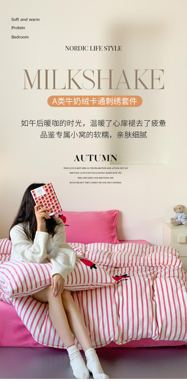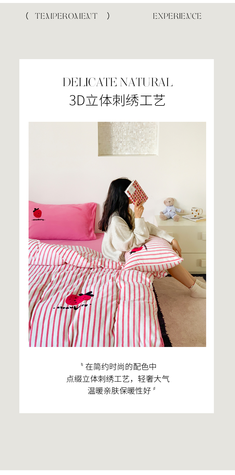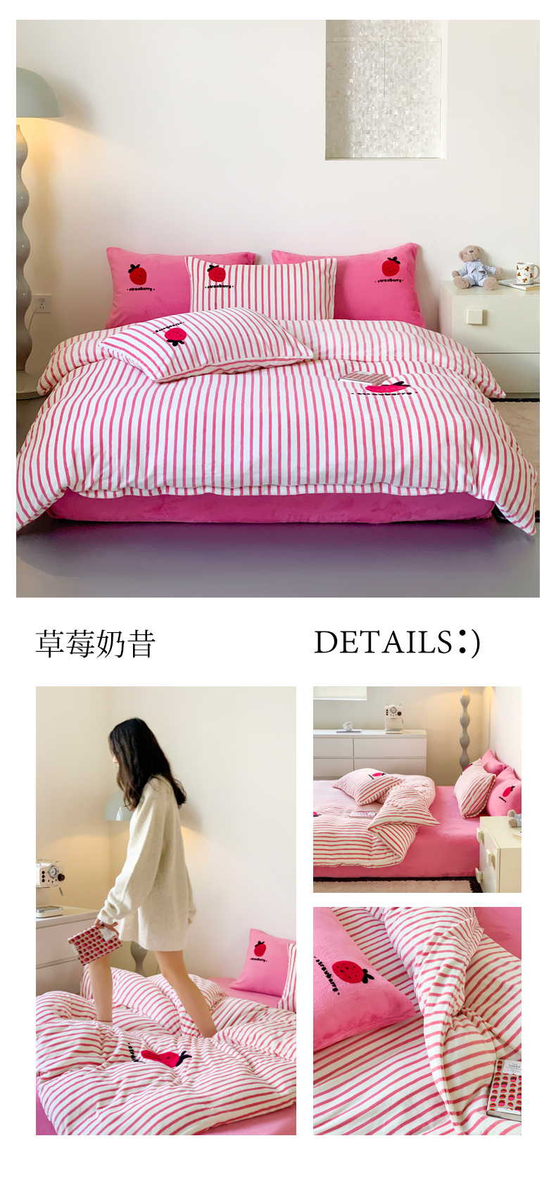 商品名称:慕晨 2025简奢新款高克重牛奶绒卡通绣花小清新可爱加厚牛奶绒四件套小红书风爆款 草莓奶昔