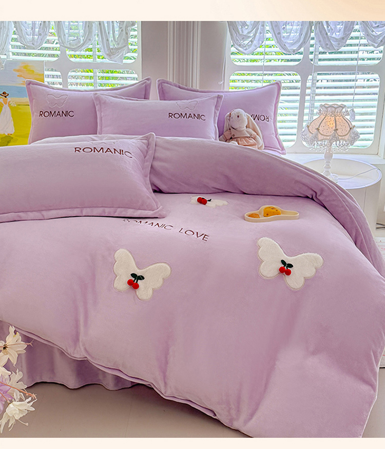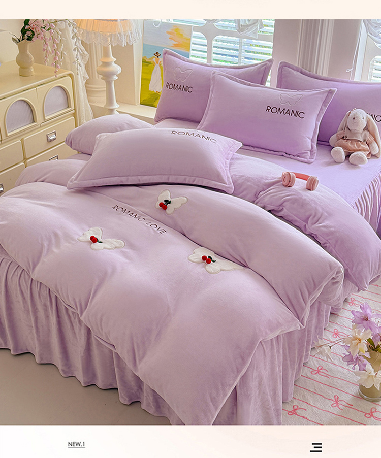 商品名称:漫布云 2025新款简约ins风A类全消光230g牛奶绒公主绒四件套床裙款被套系列 蝶影—梦幻紫