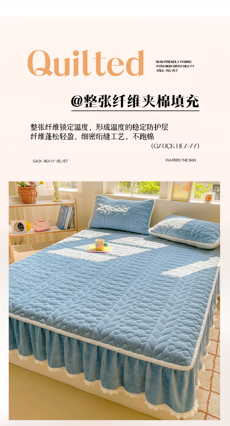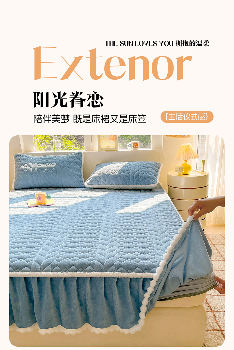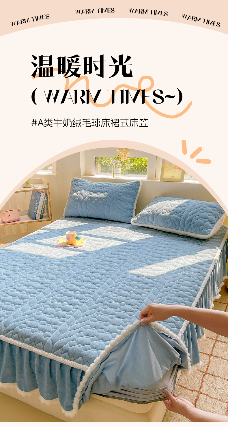 • 91家纺网 家纺一手货源 找家纺 眠势力 2025新款牛奶绒床笠夹棉加厚保暖床垫保护套韩版床裙床笠二合一毛球球带裙边款 冰雪兰-毛球款