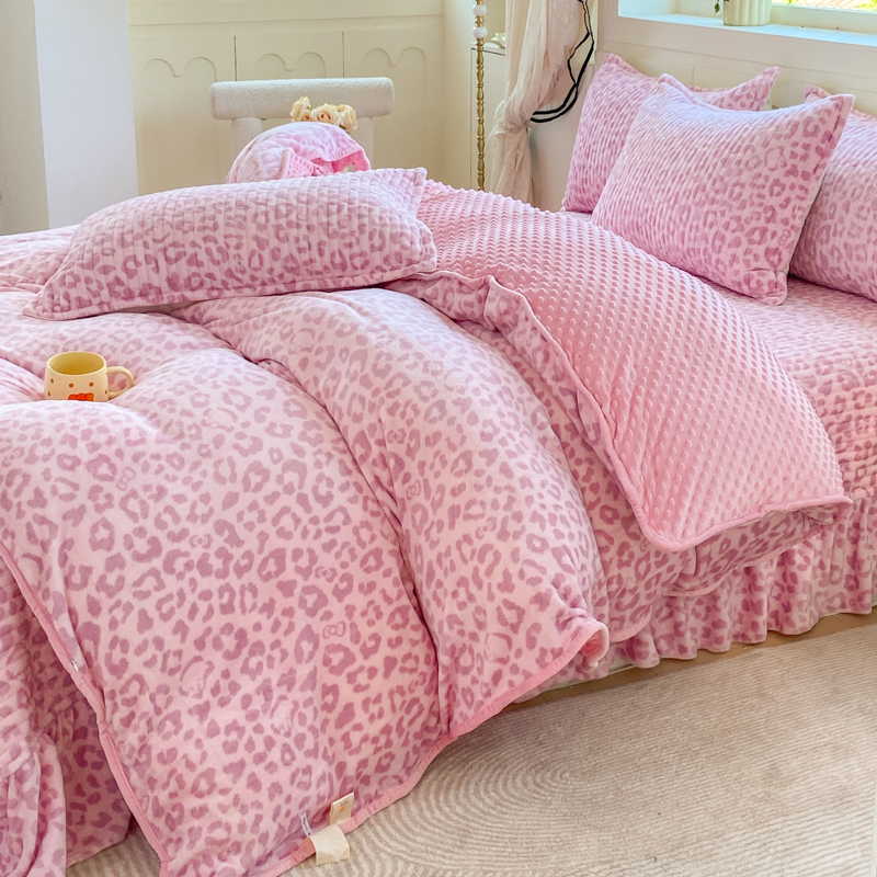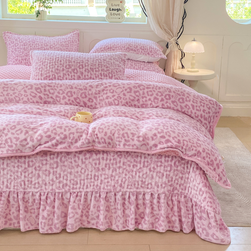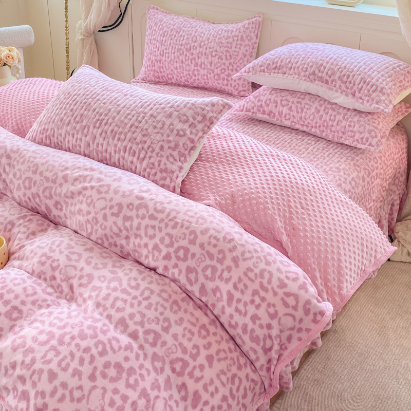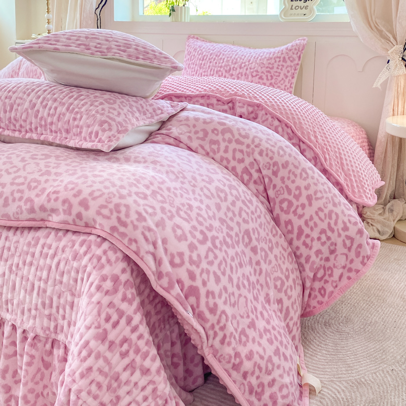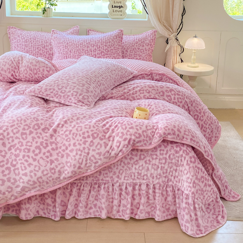 商品名称:尚美 2025新款豆豆绒牛奶绒大花边床盖四件套(床盖花边随机) 粉豹纹