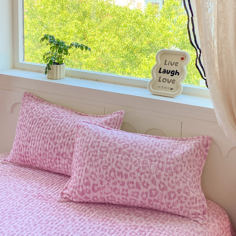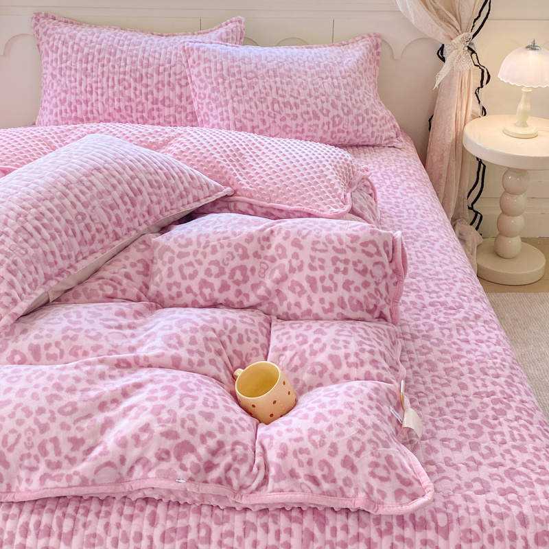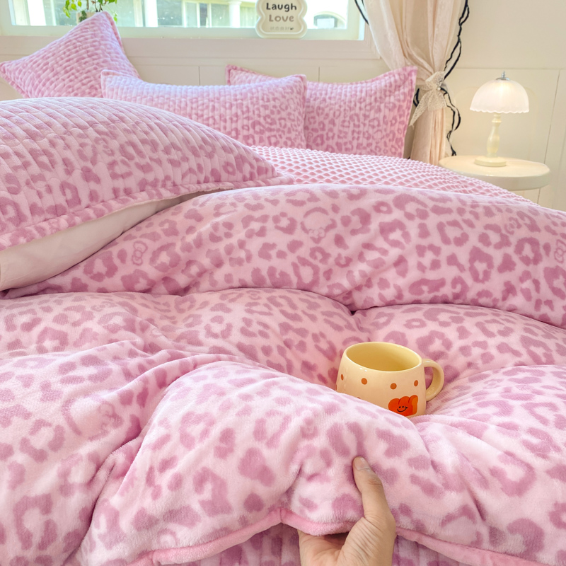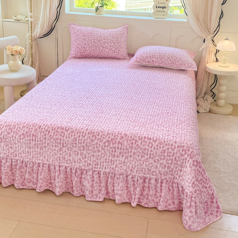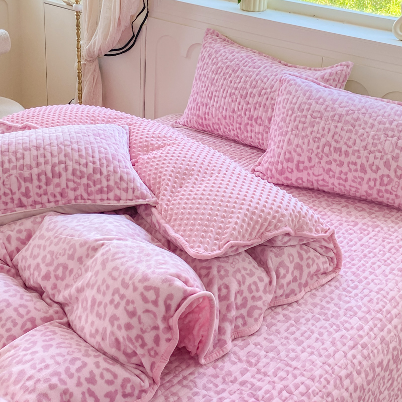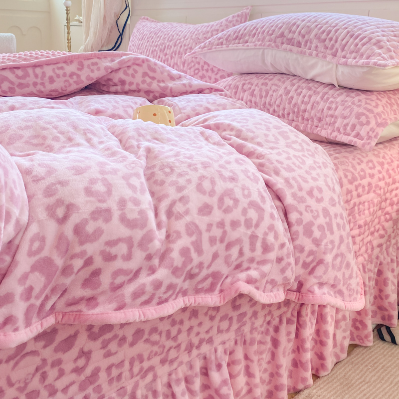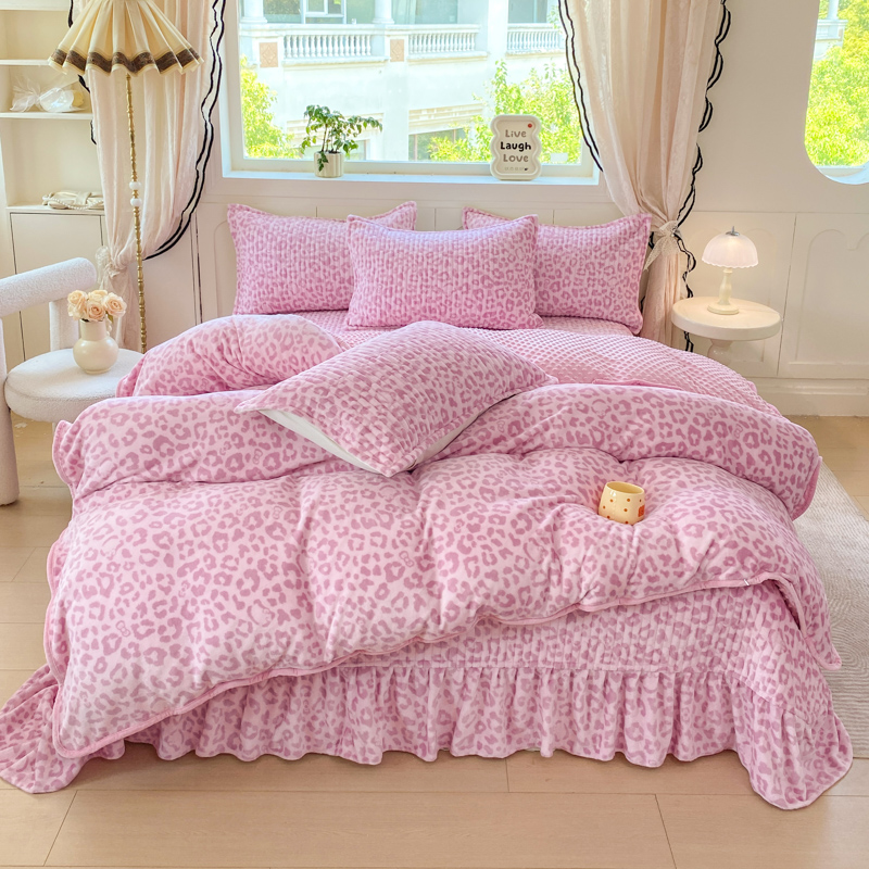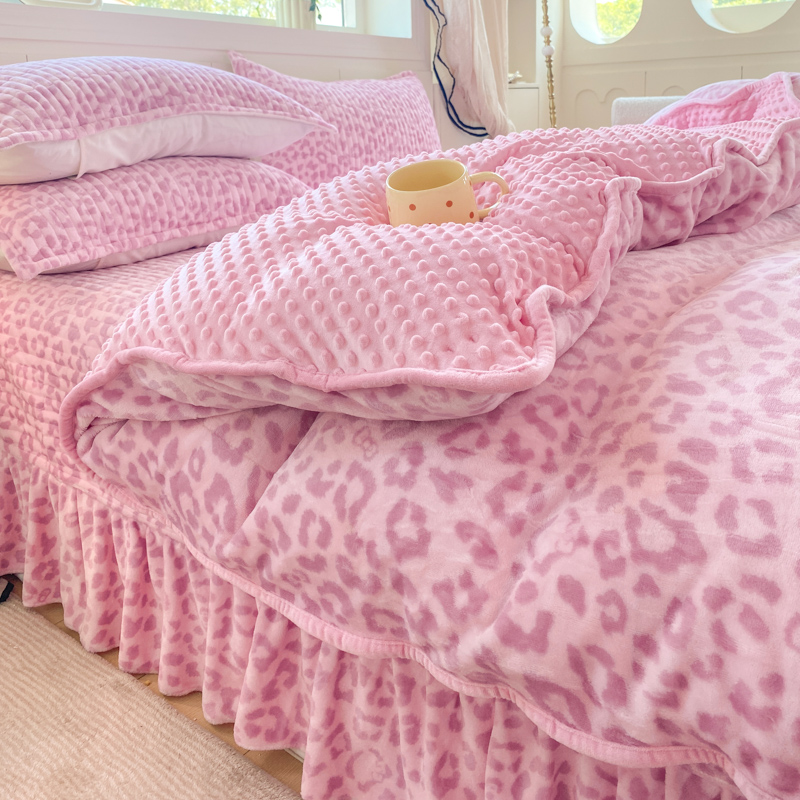尚美 2025新款豆豆绒牛奶绒大花边床盖四件套(床盖花边随机) 粉豹纹