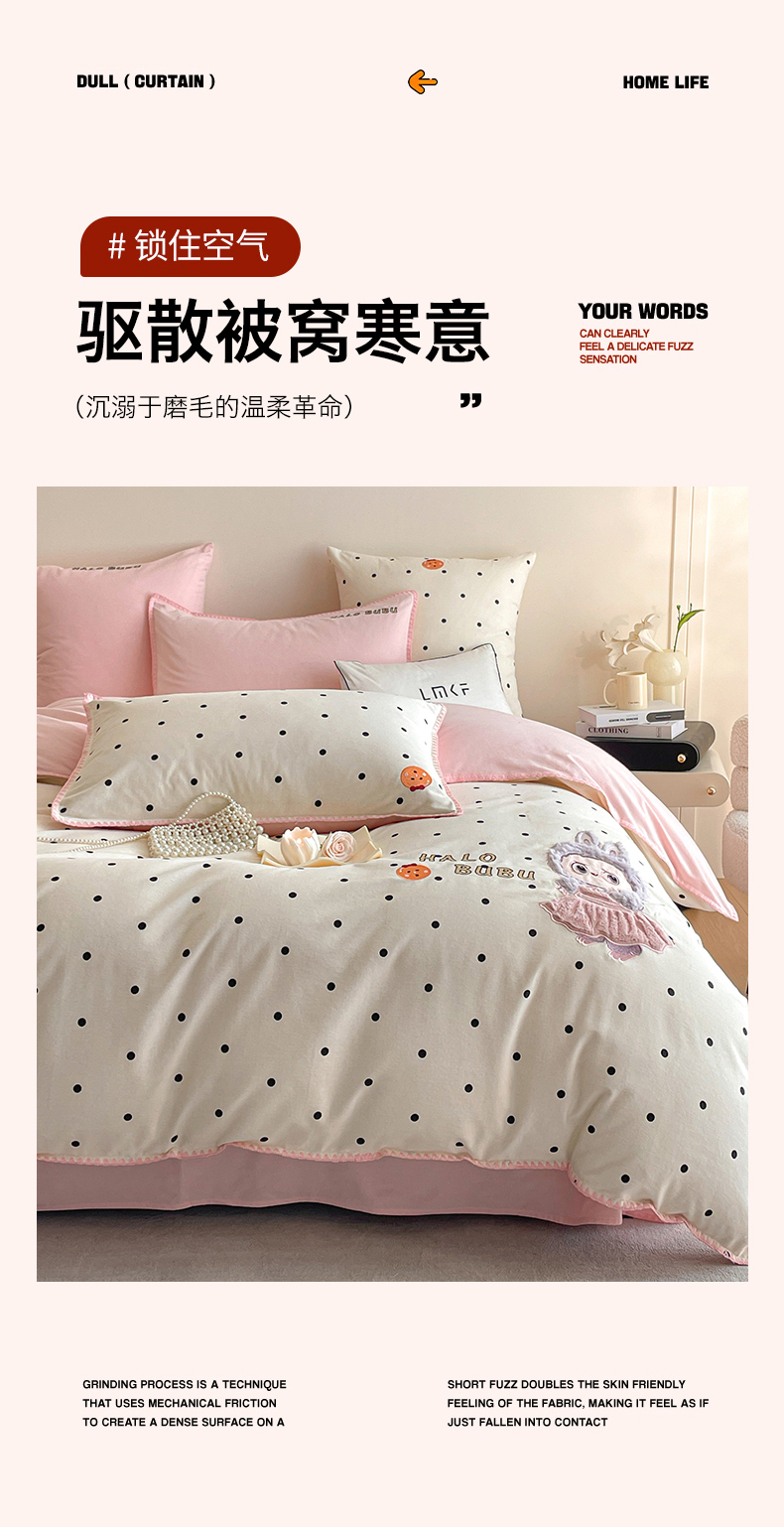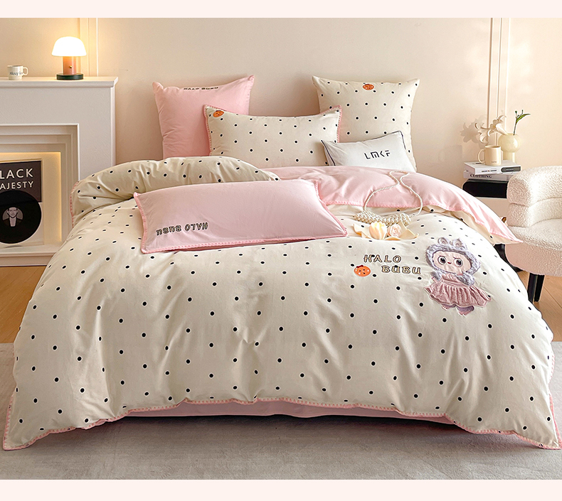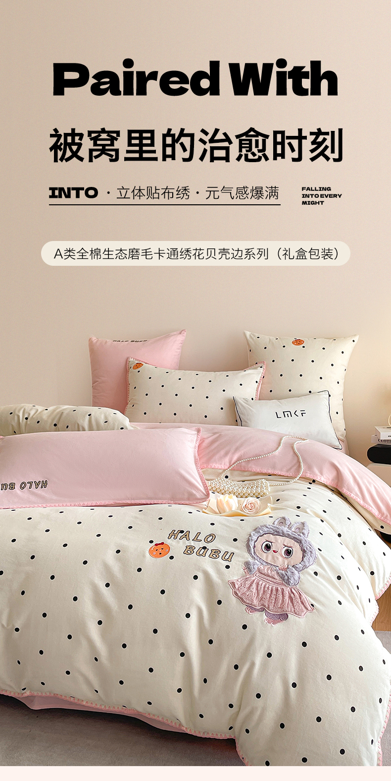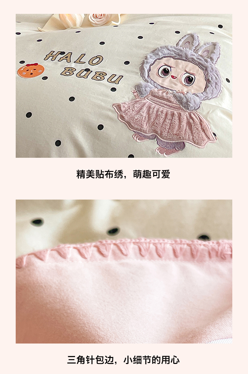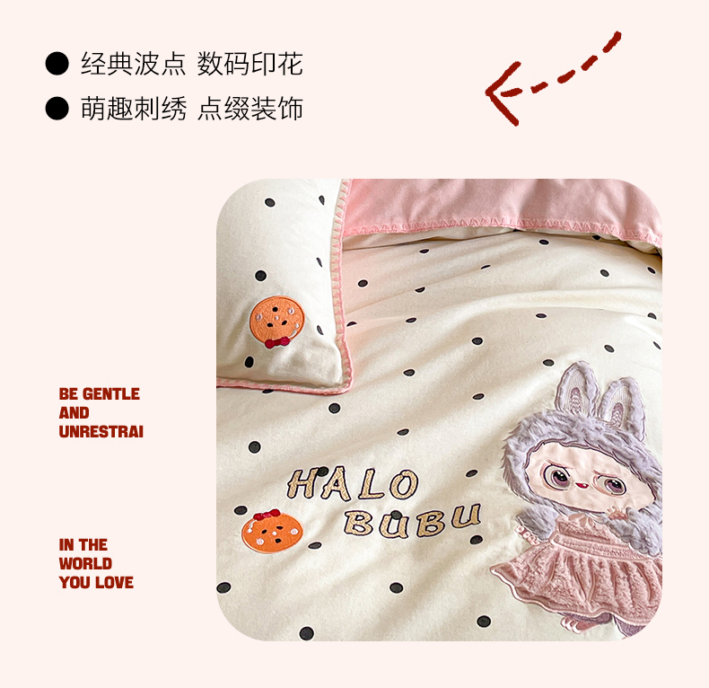 商品名称:蓝米卡夫 2025秋冬-A类全棉生态磨毛卡通绣花贝壳边系列(礼盒包装)【如需买家秀联系15996631948】 1号波点白-香草粉