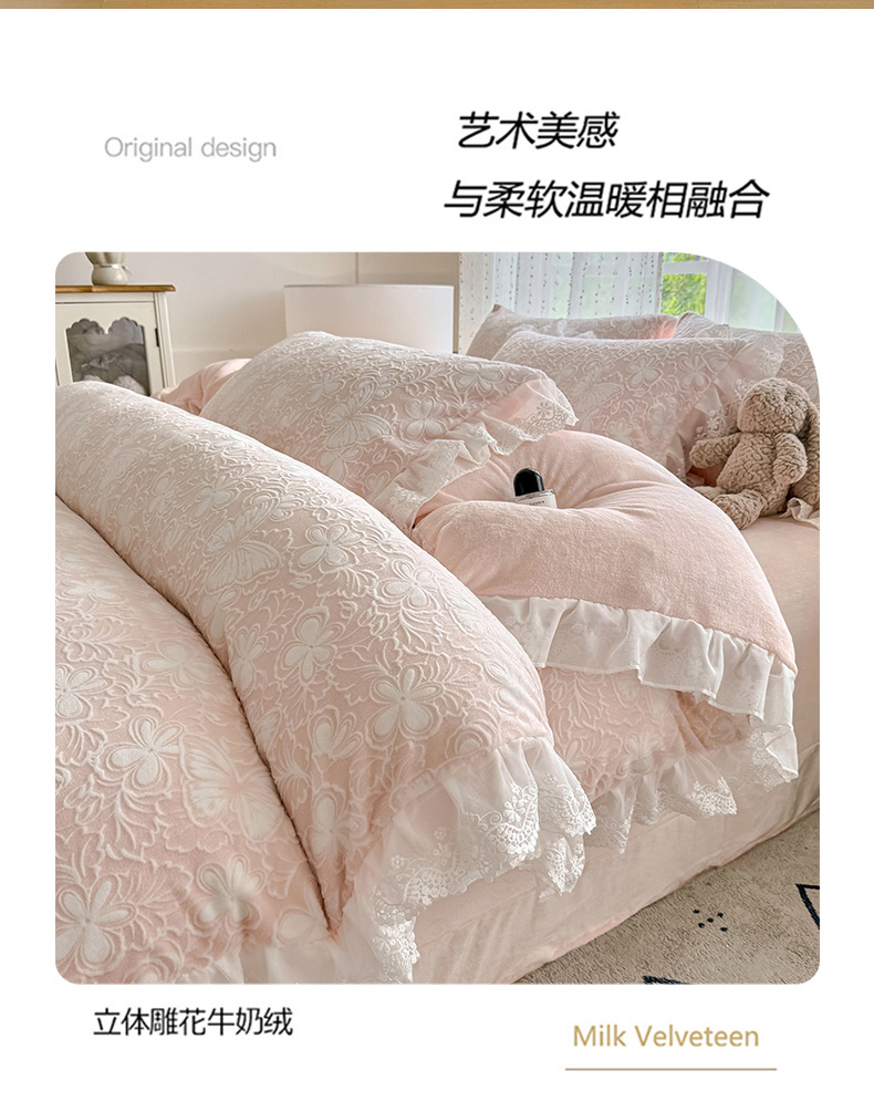 (总)锦格家纺 2025新款A类高克重雕花牛奶绒花边四件套,梦幻-玉粉,初薇-豆沙,初薇-绿,初薇-玉粉,幻梦-黄,幻梦-天蓝,蝶漫-奶白,蝶漫-天蓝