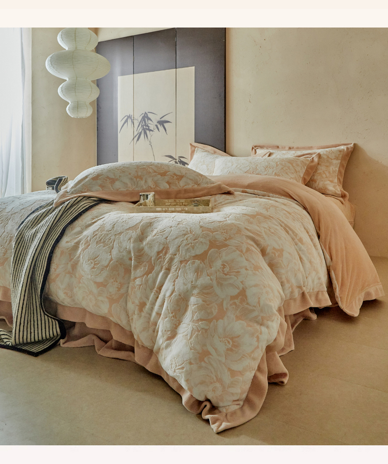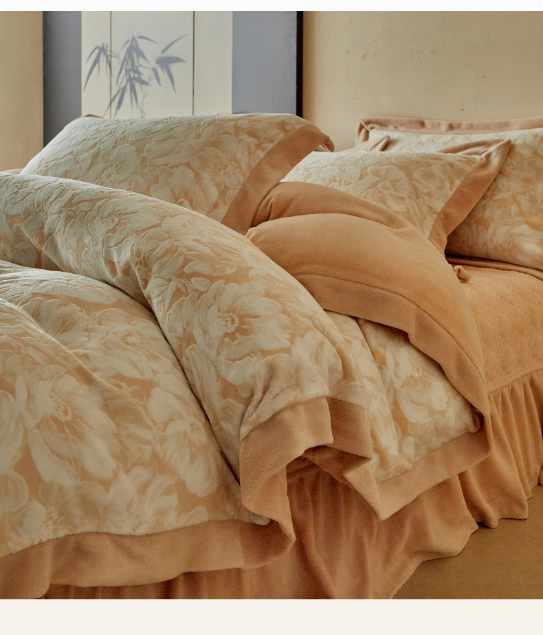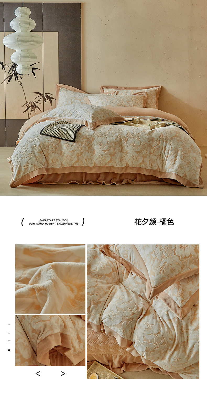 商品名称:孑寐家纺 2025新款宽边拼角雕花绒床盖四件套 香雪海-橘色
