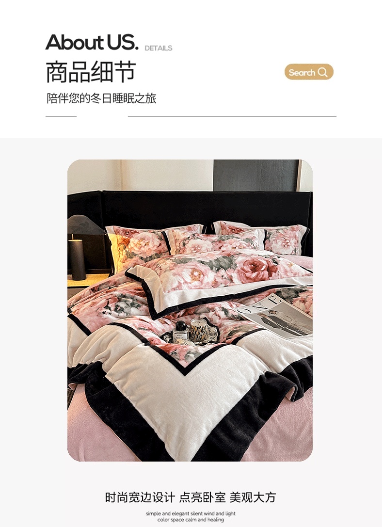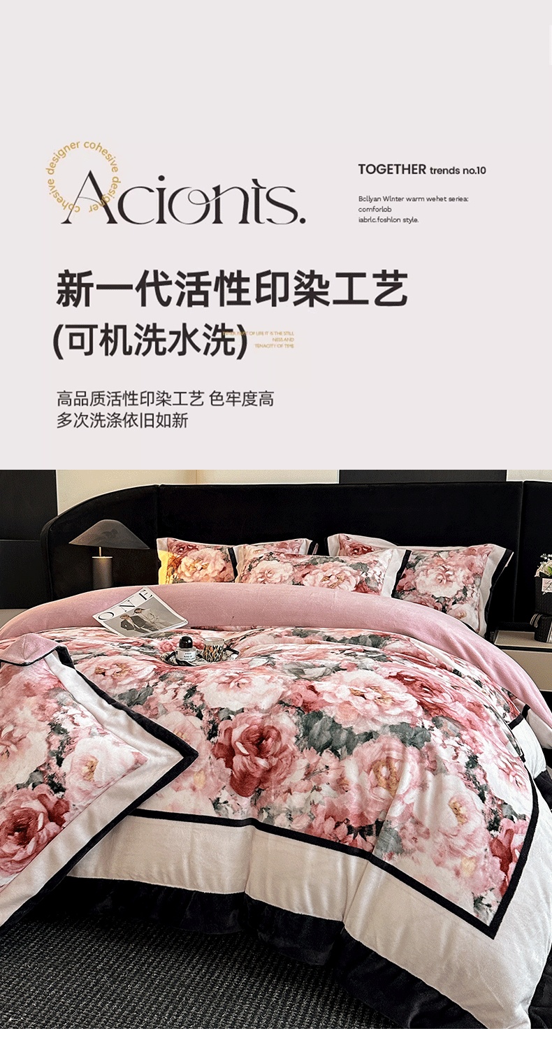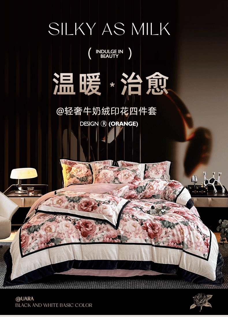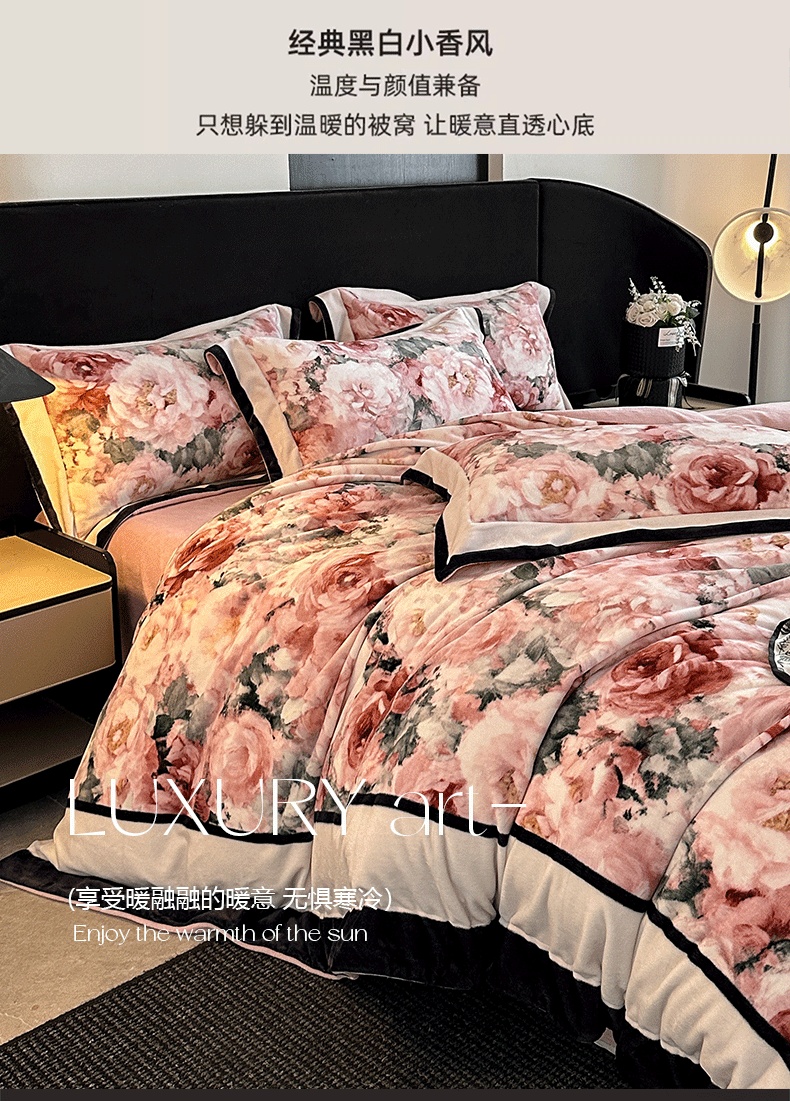 商品名称:花漾家居 2025新款秋冬新品法式轻奢复古宽边大版牛奶绒四件套(提供买家秀) 玫瑰从中