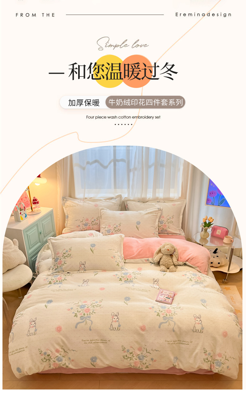 (总)慕尚家纺 2025新款豆豆绒刺绣四件套,大耳狗 白蓝,玫瑰 白粉