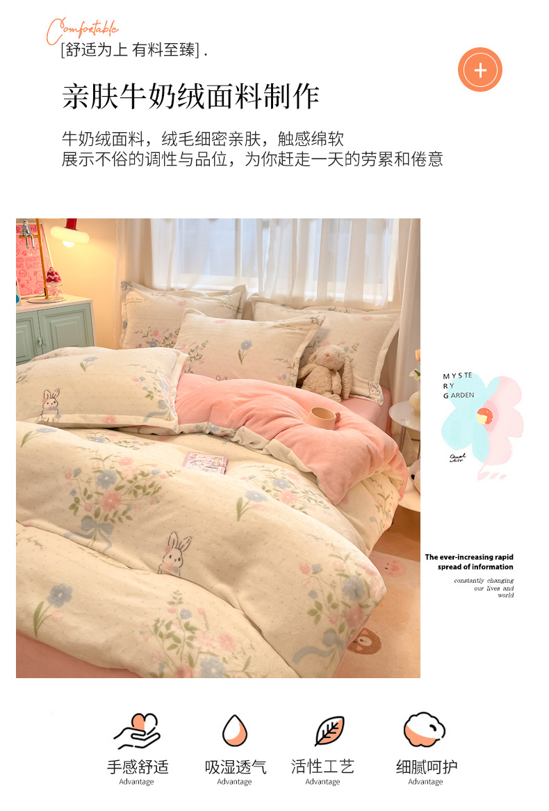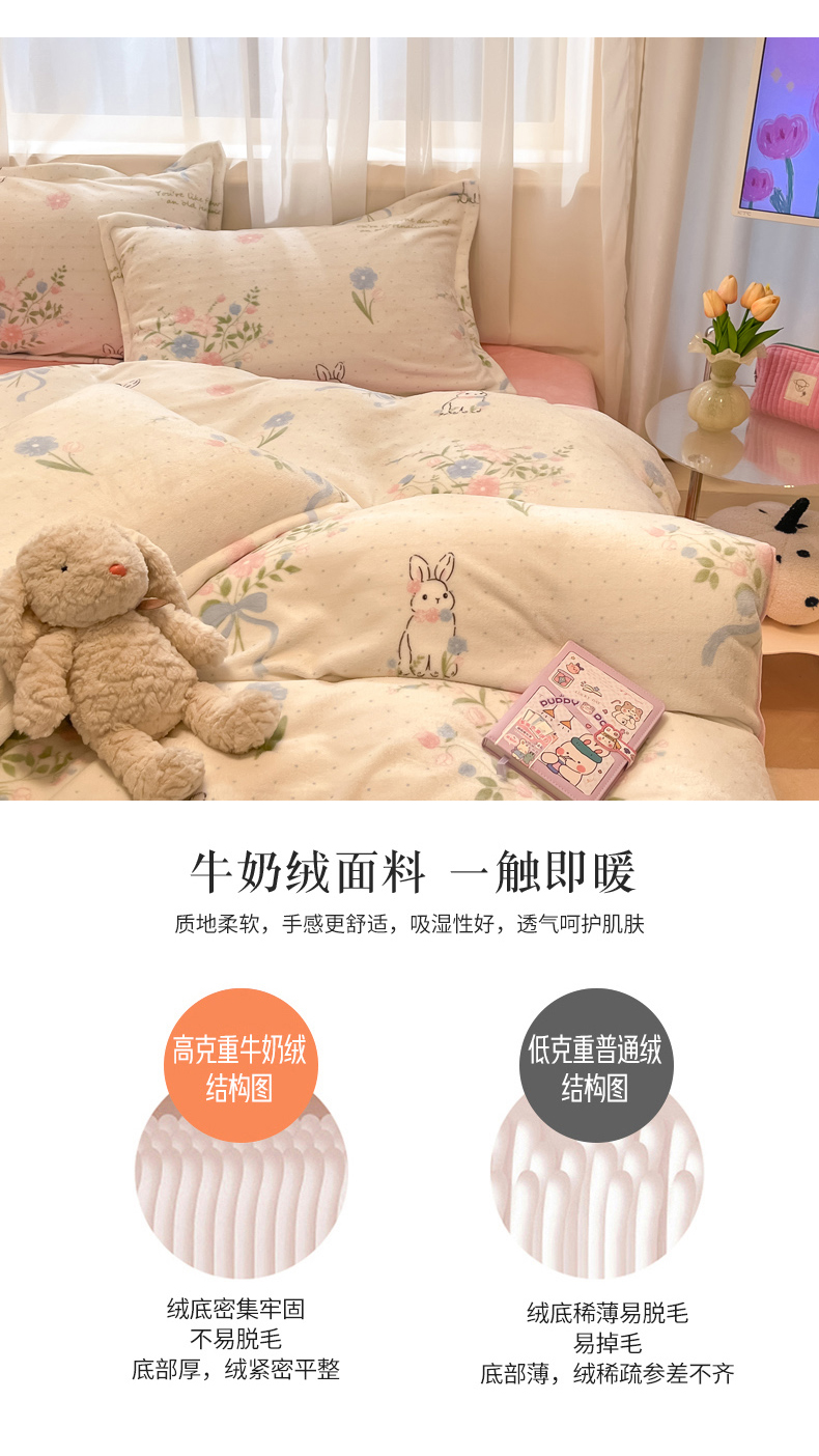 商品名称:慕尚家纺 2025新款田园花卉类印花牛奶绒高克重单被套 鲜花小兔
