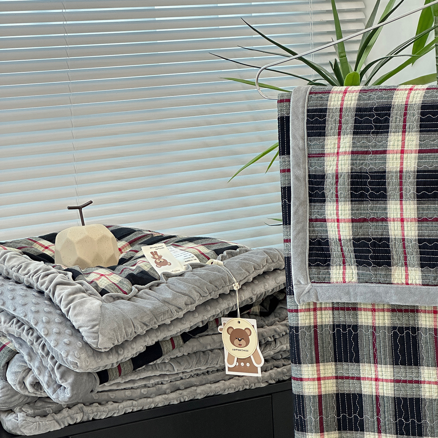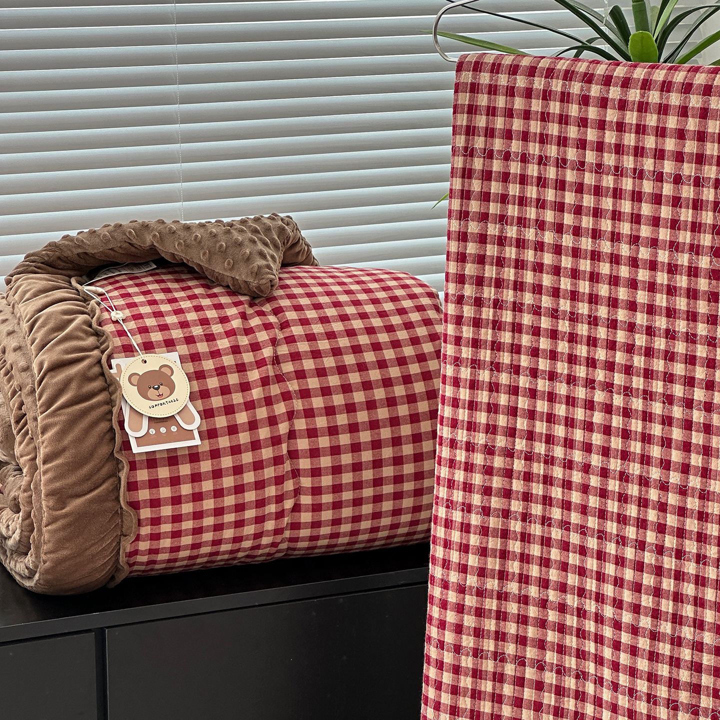 (总)佰织鑫家居 2025新款全棉纯棉色织水洗棉加绒床盖豆豆被四件套,木槿-黑,小红格,云曲粉咖,云曲灰咖