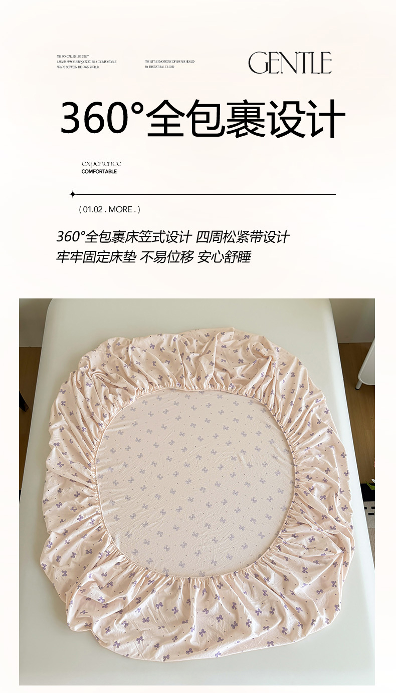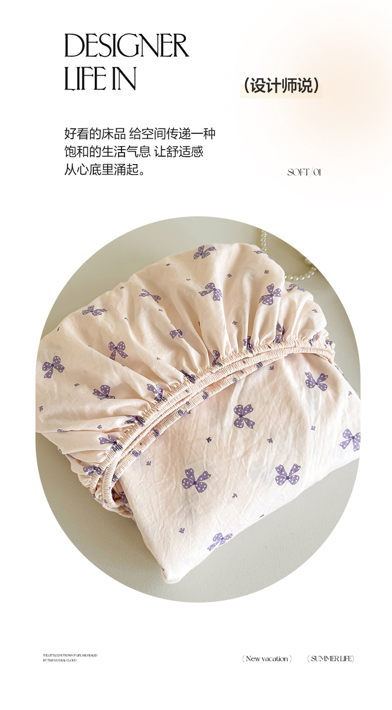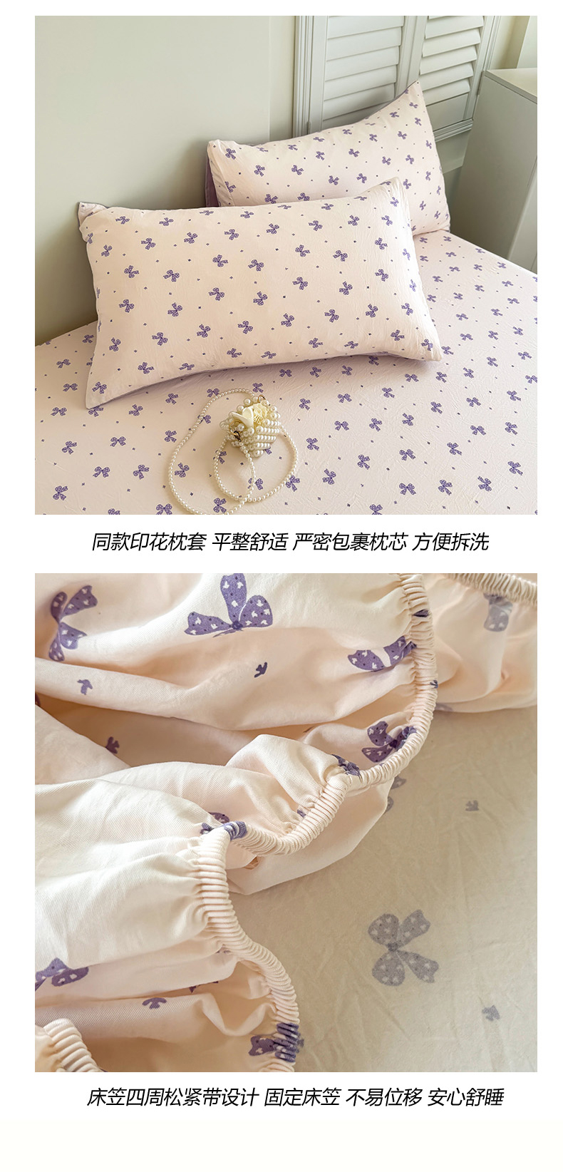 卢赛尔 2025新款水洗珍珠棉皱皱纱印花床笠 蝴蝶结紫