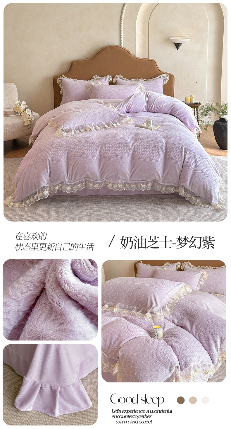 当前位置: 91家纺网 > 商品网购 > 床品套件 > 四件套 > 牛奶绒四件套 > 爱家(原缔乐家纺) 2025新款A类牛奶雕花绒四件套 铃兰花+奶油芝士系列(床盖加20)奶油芝士-梦幻紫