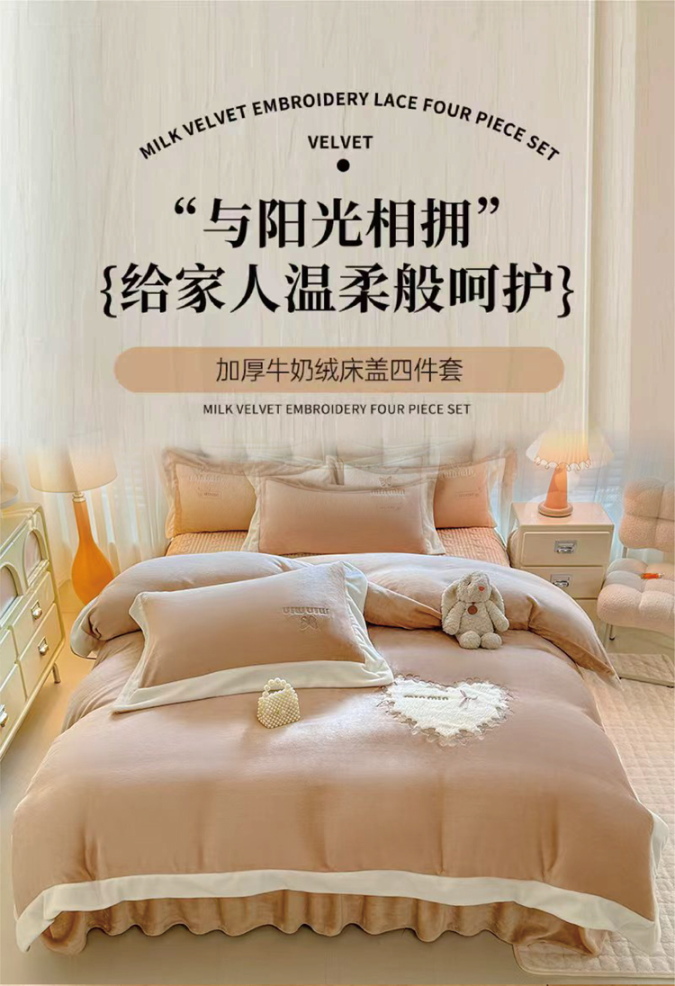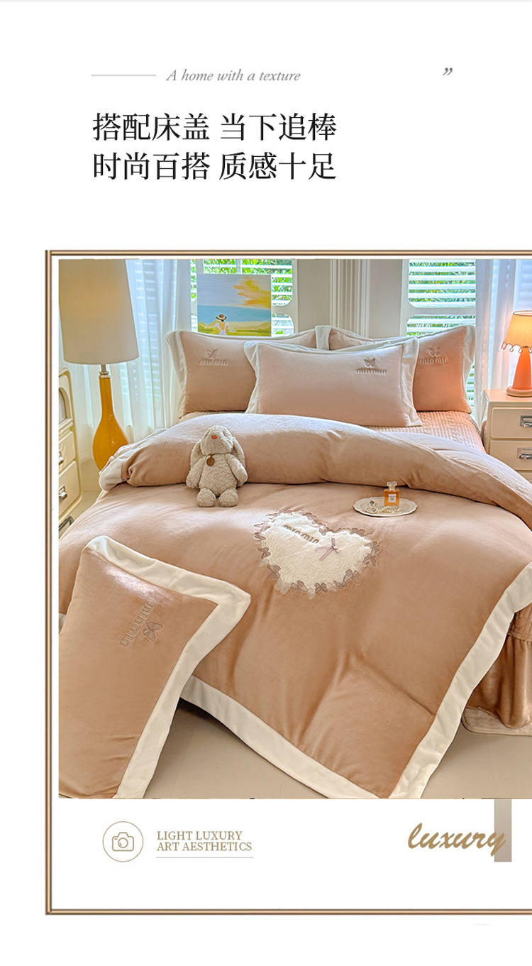(总)漫布云2025秋冬简约轻奢款230g全消光牛奶绒兔毛绒贴布绣花夹棉床盖款四件套纯色蕾丝花边刺绣床裙款床盖--心愿系列
