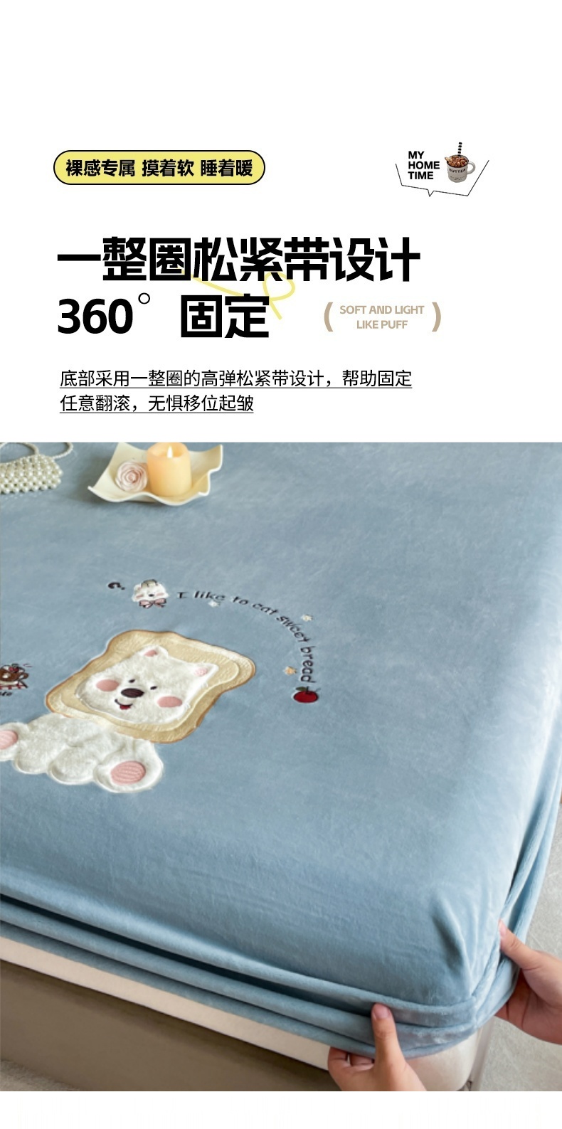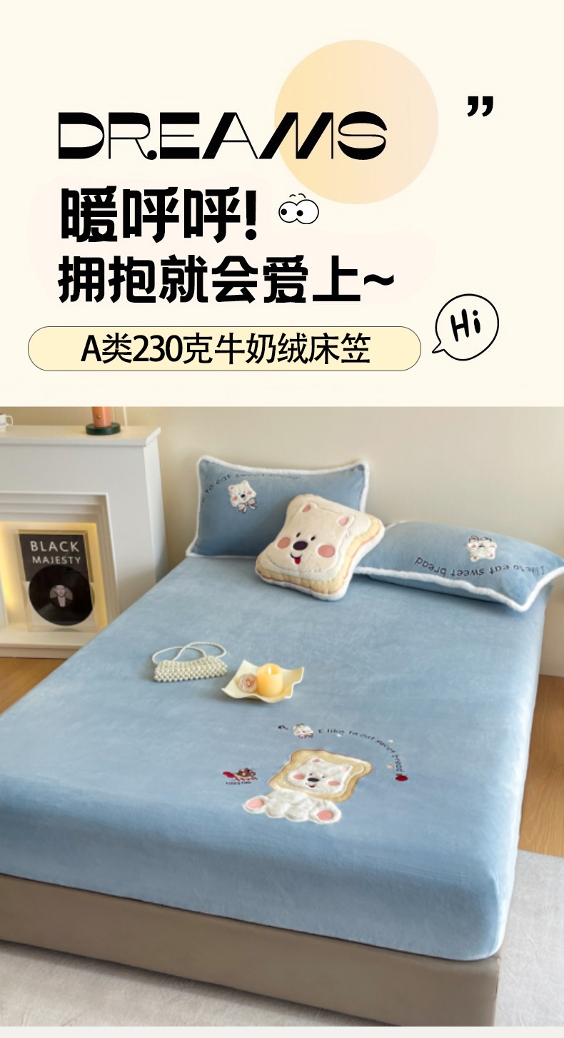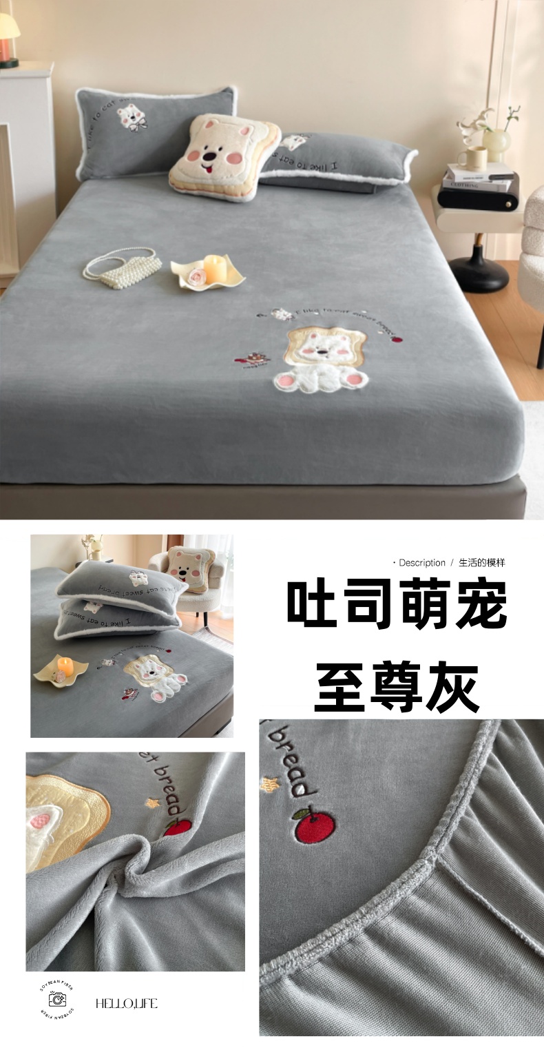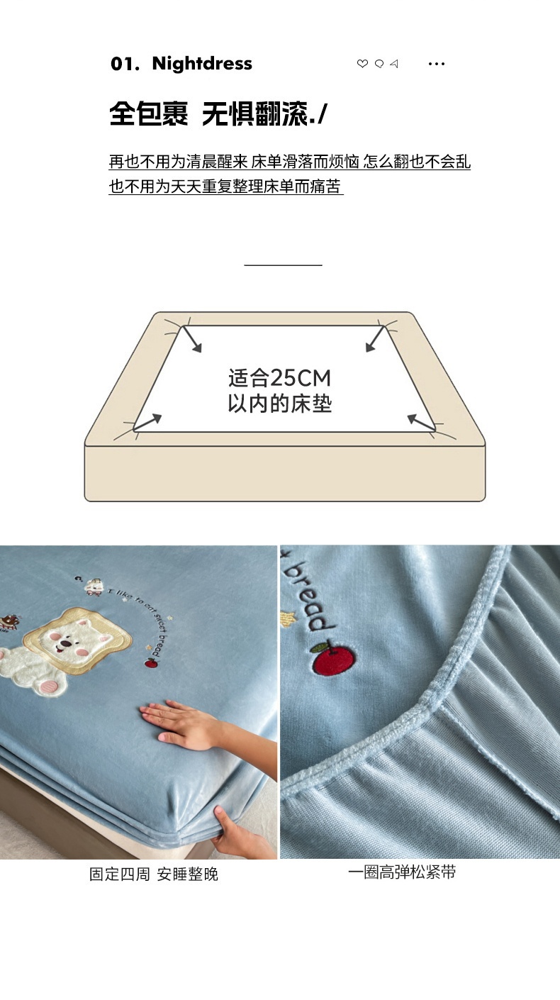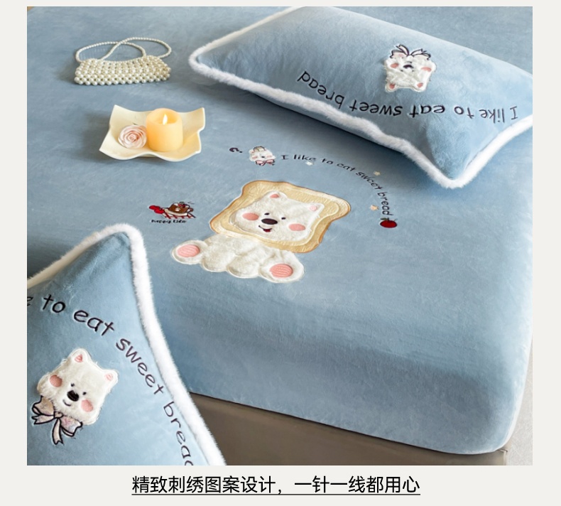 梦舒羽 2025新款A类230克全消光刺绣贴布牛奶绒床笠加绒法兰绒床垫保护罩床罩 吐司萌宠-高贵蓝