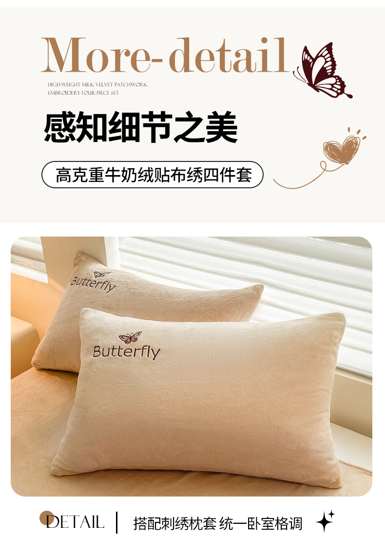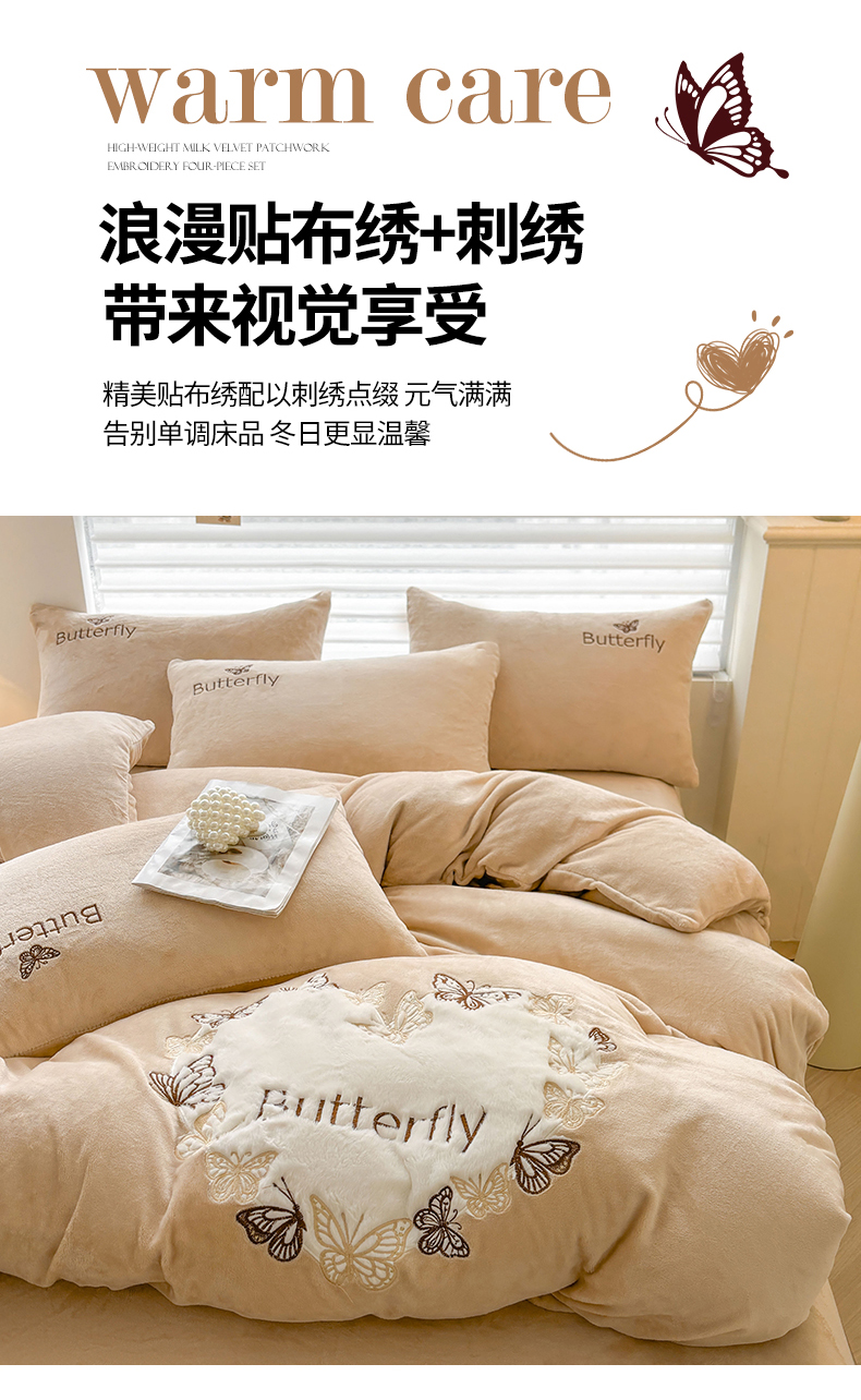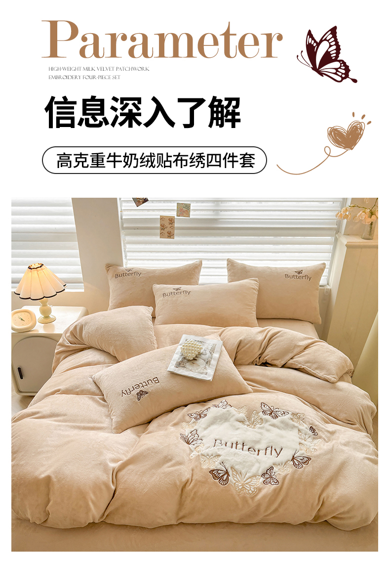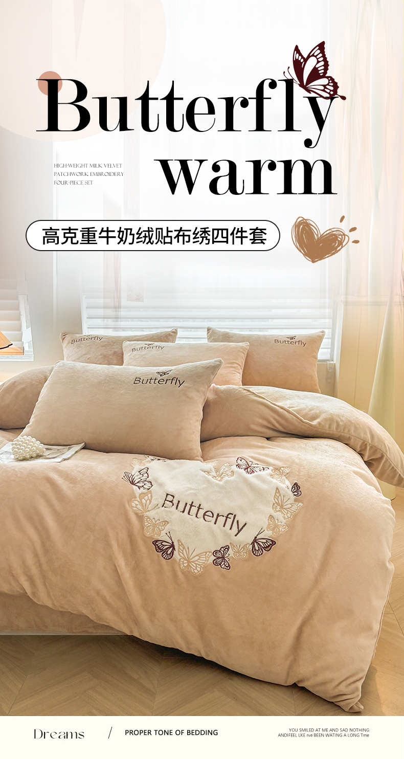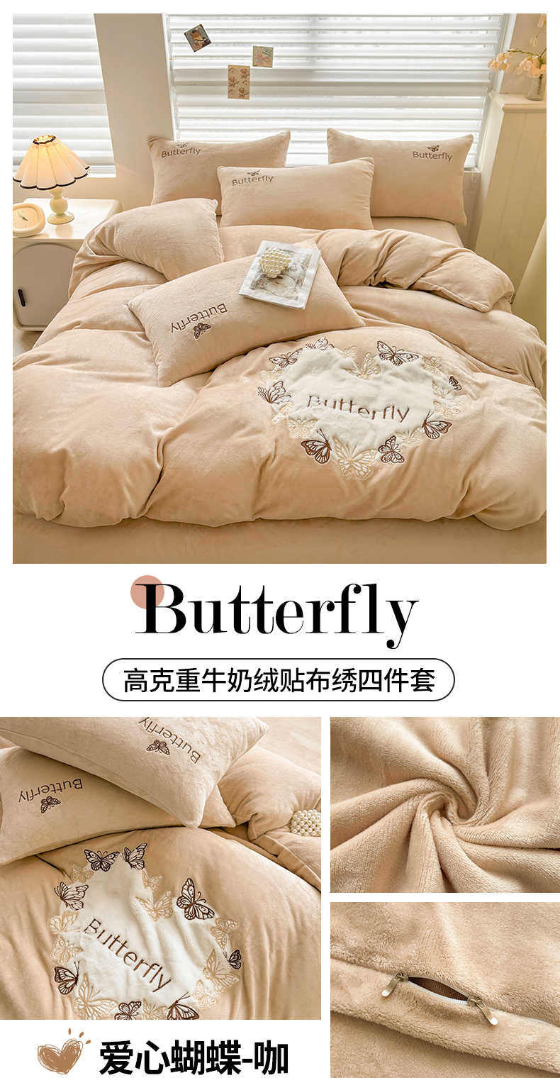 当前位置: 91家纺网 > 商品网购 > 床品套件 > 四件套 > 牛奶绒四件套 > 义博家纺 2025新款高克重牛奶绒蝴蝶贴布绣四件套 爱心蝴蝶-咖