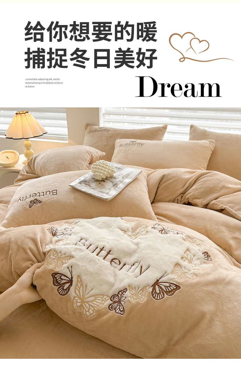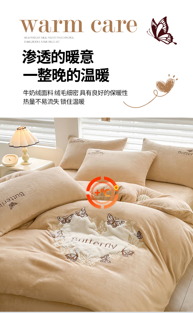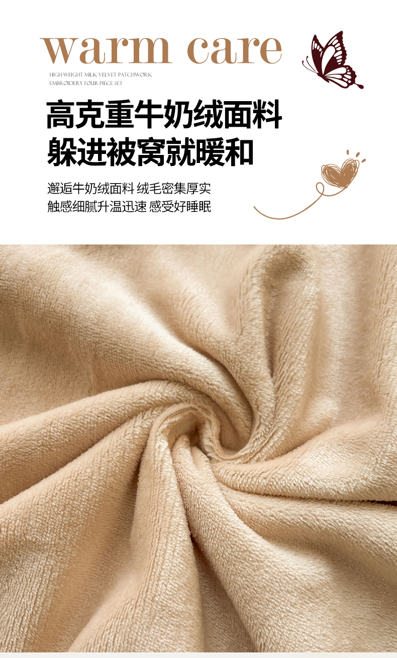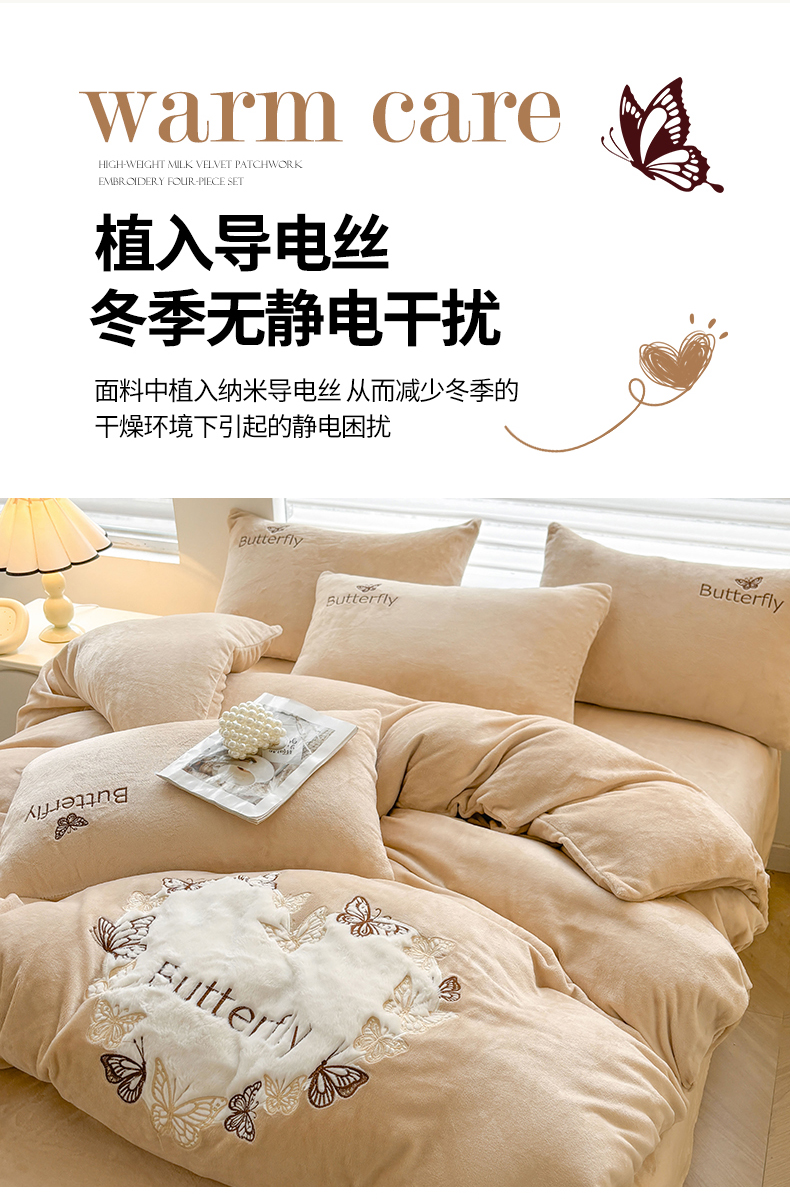 当前位置: 91家纺网 > 商品网购 > 床品套件 > 四件套 > 牛奶绒四件套 > 义博家纺 2025新款高克重牛奶绒蝴蝶贴布绣四件套 爱心蝴蝶-咖