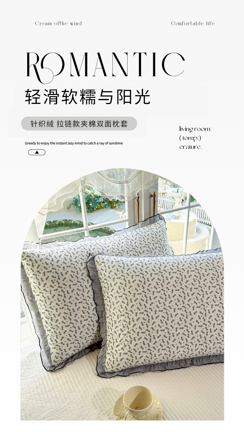 • 91家纺网 家纺一手货源 找家纺 呦呦南宋 2025新款韩版35x55cm针织绒枕套双面两用绣线花边中层超声波夹棉单只装单品隐藏拉链款枕头套 小葵朵