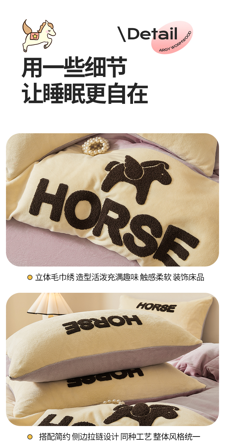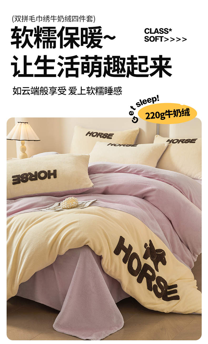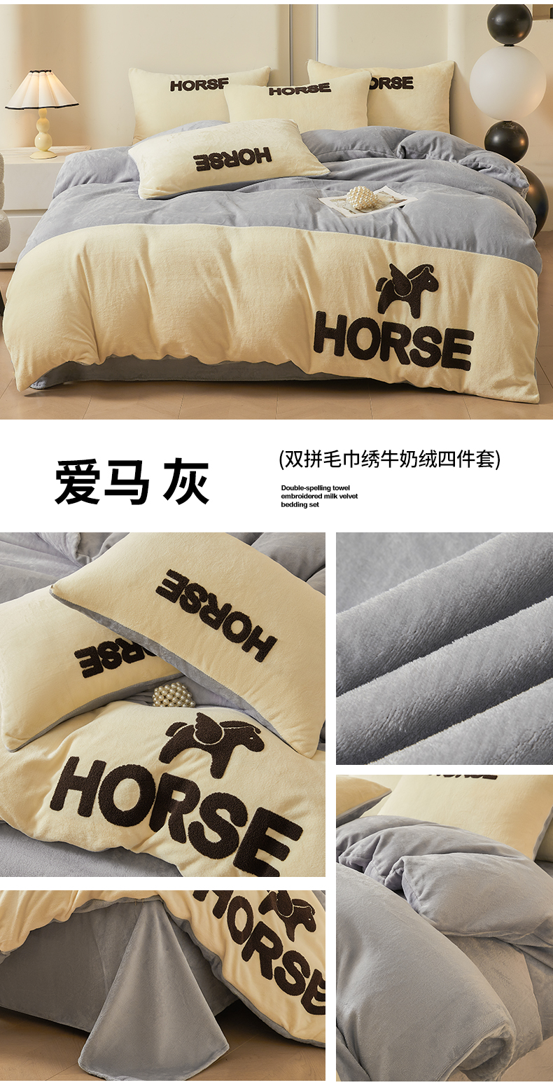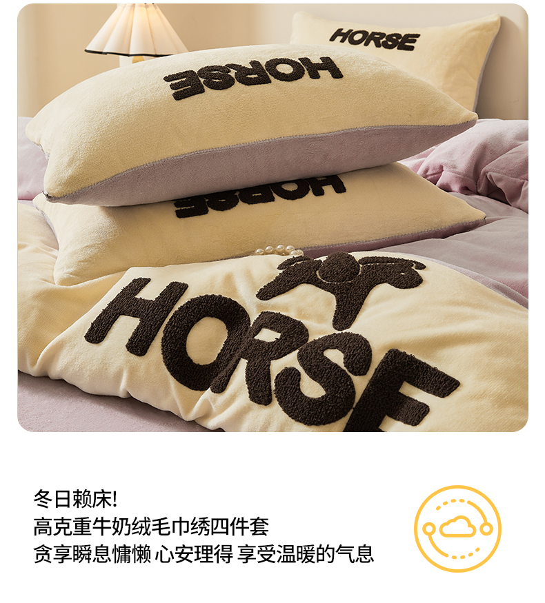 当前位置: 91家纺网 > 商品网购 > 床品套件 > 四件套 > 牛奶绒四件套 > 义博家纺 2025新款高克重牛奶绒双拼毛巾绣爱马系列四件套 爱马 紫