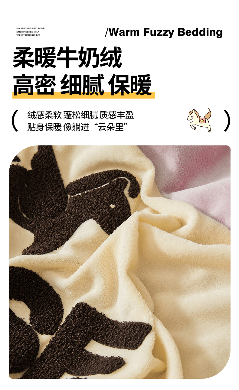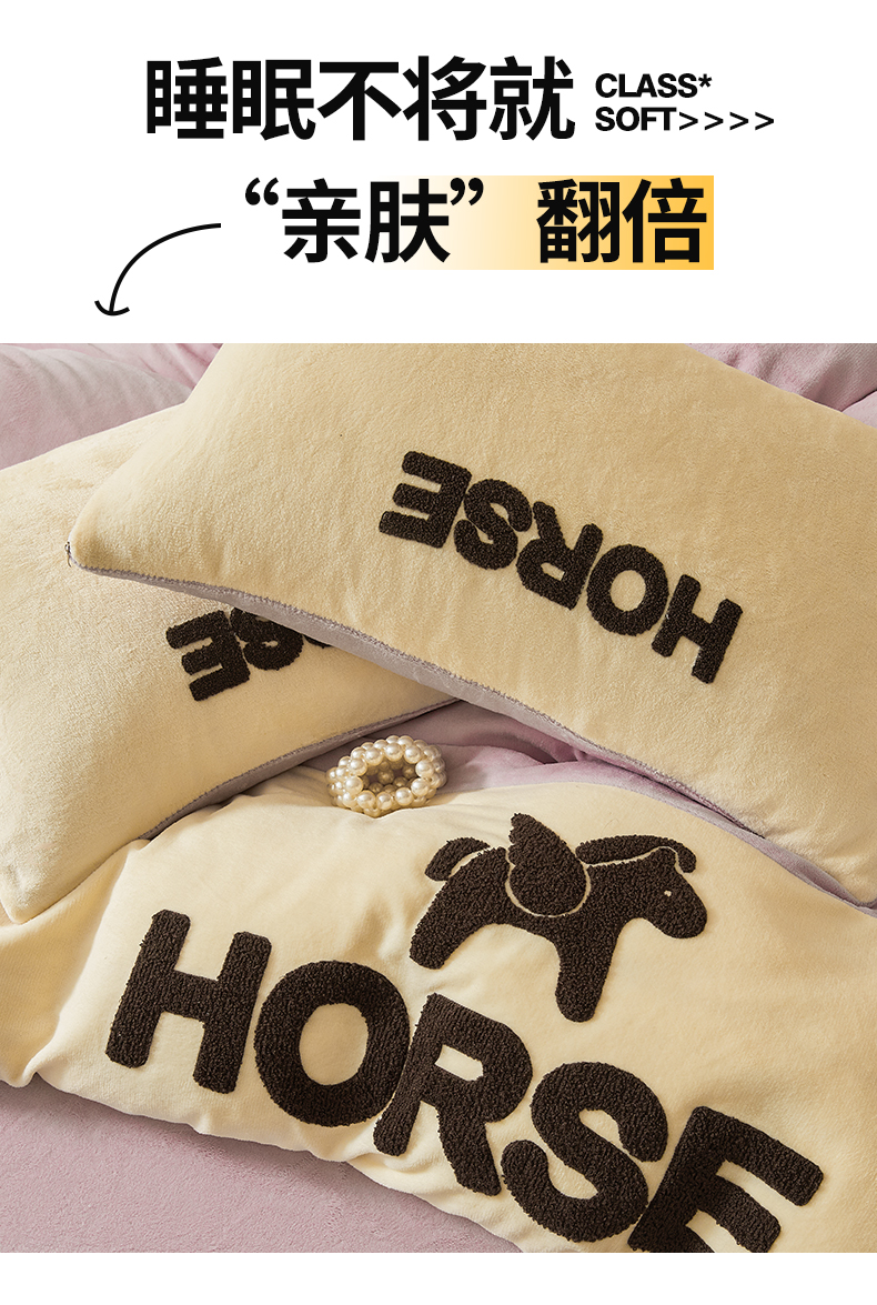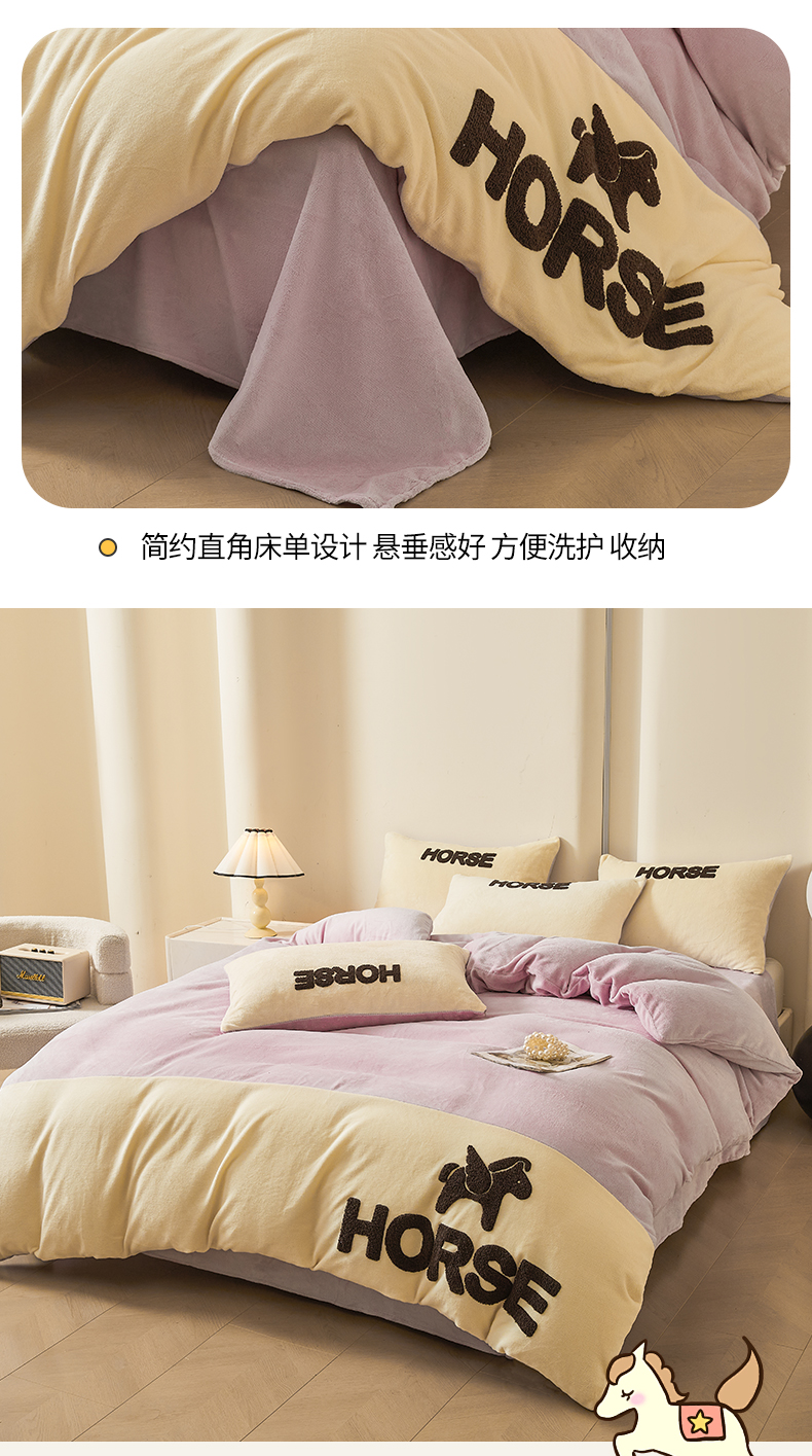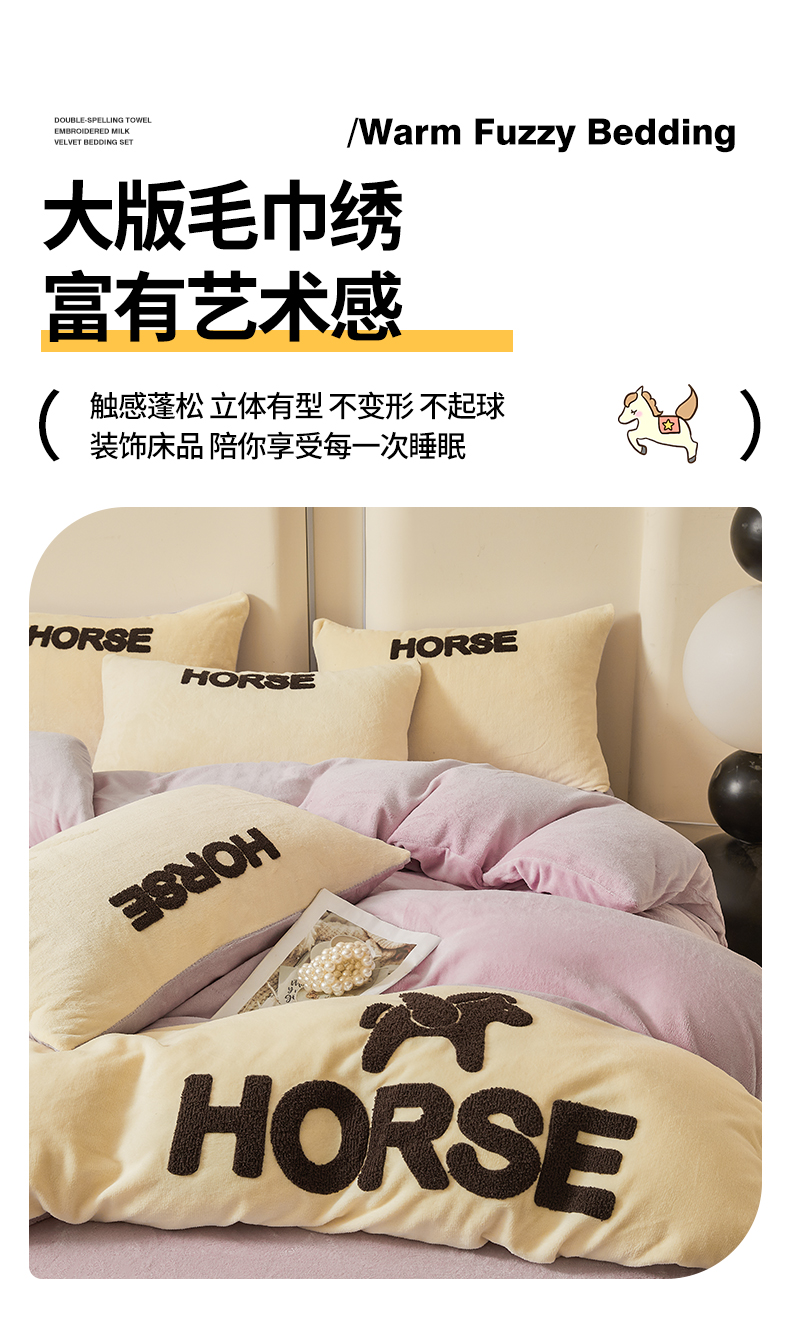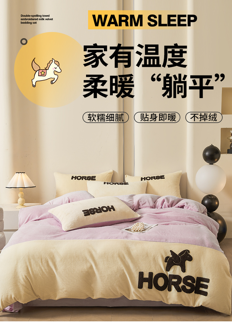 当前位置: 91家纺网 > 商品网购 > 床品套件 > 四件套 > 牛奶绒四件套 > 义博家纺 2025新款高克重牛奶绒双拼毛巾绣爱马系列四件套 爱马 紫