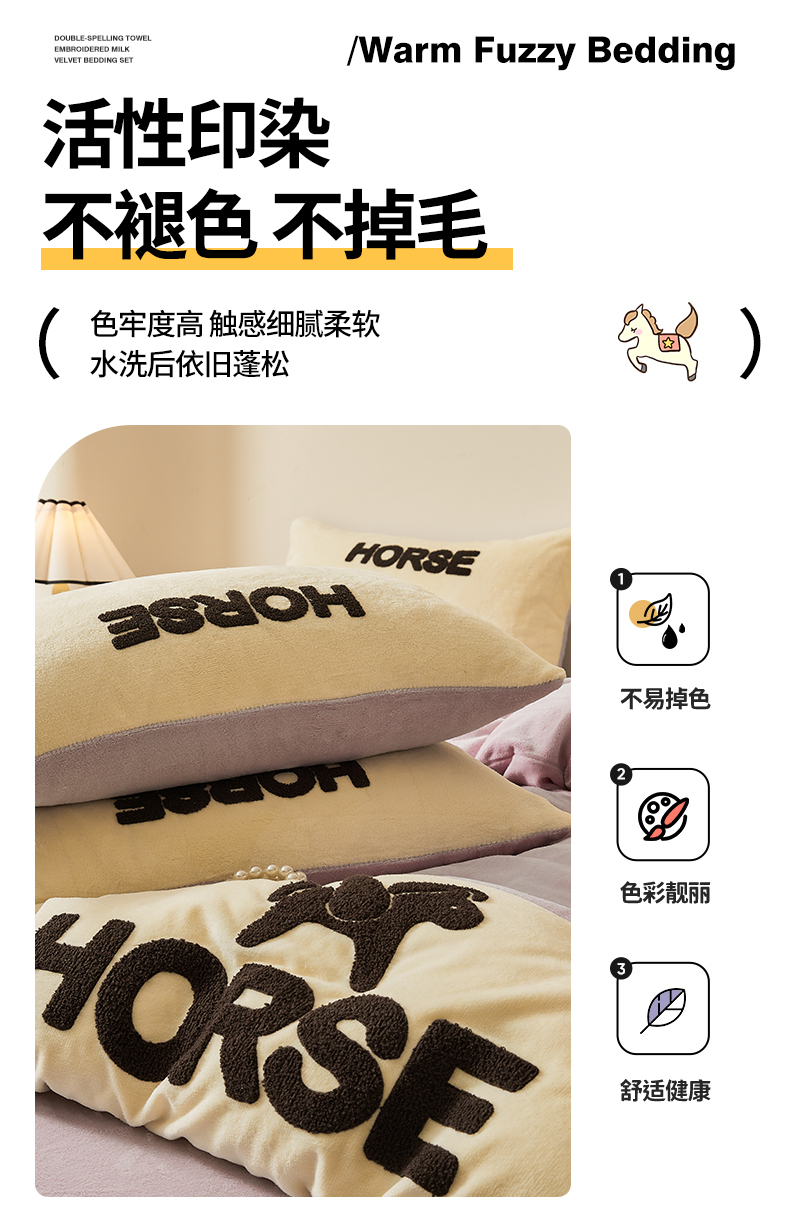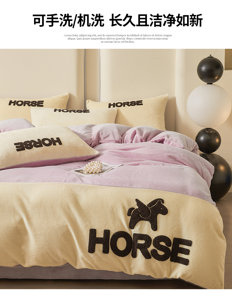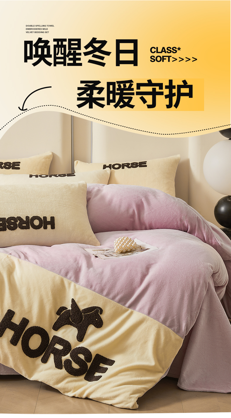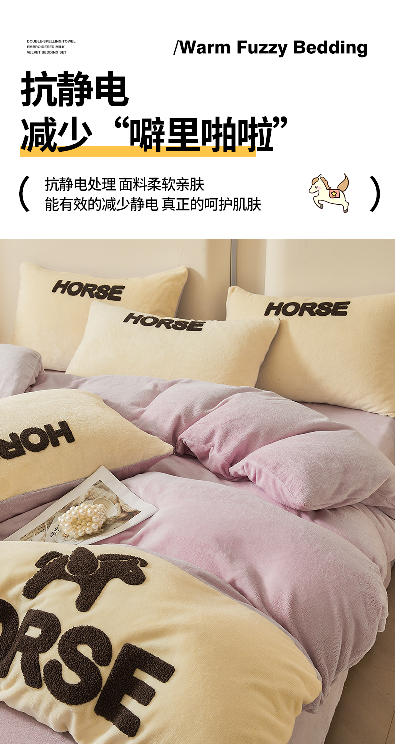 当前位置: 91家纺网 > 商品网购 > 床品套件 > 四件套 > 牛奶绒四件套 > 义博家纺 2025新款高克重牛奶绒双拼毛巾绣爱马系列四件套 爱马 紫