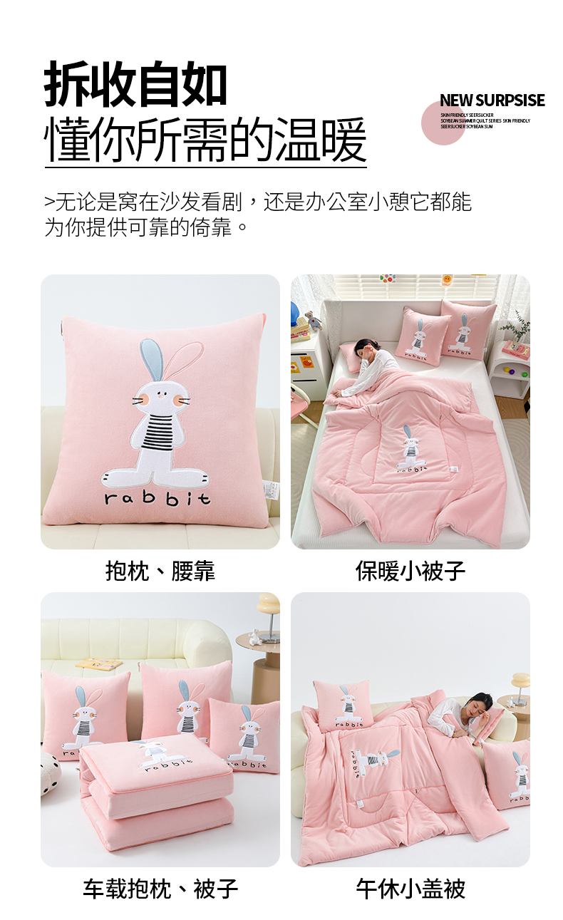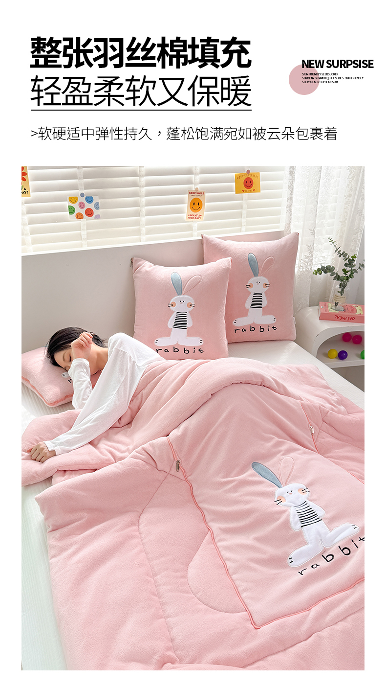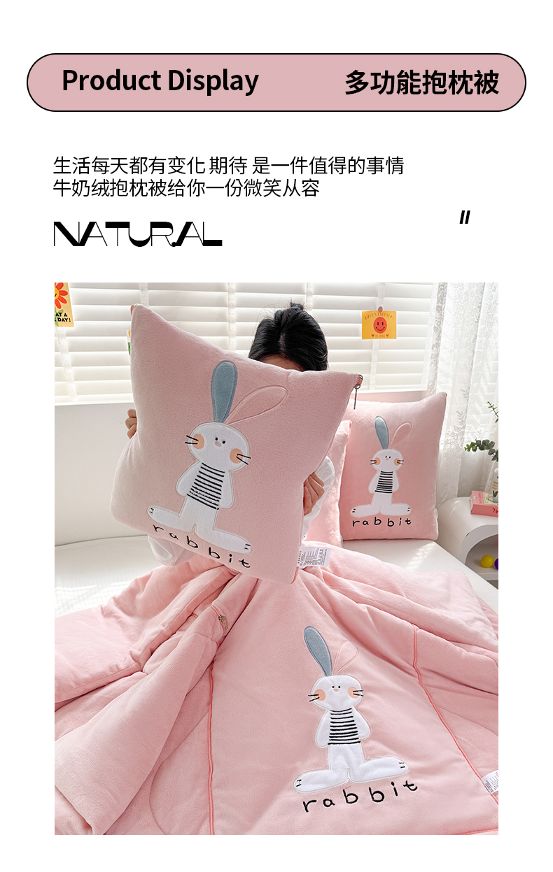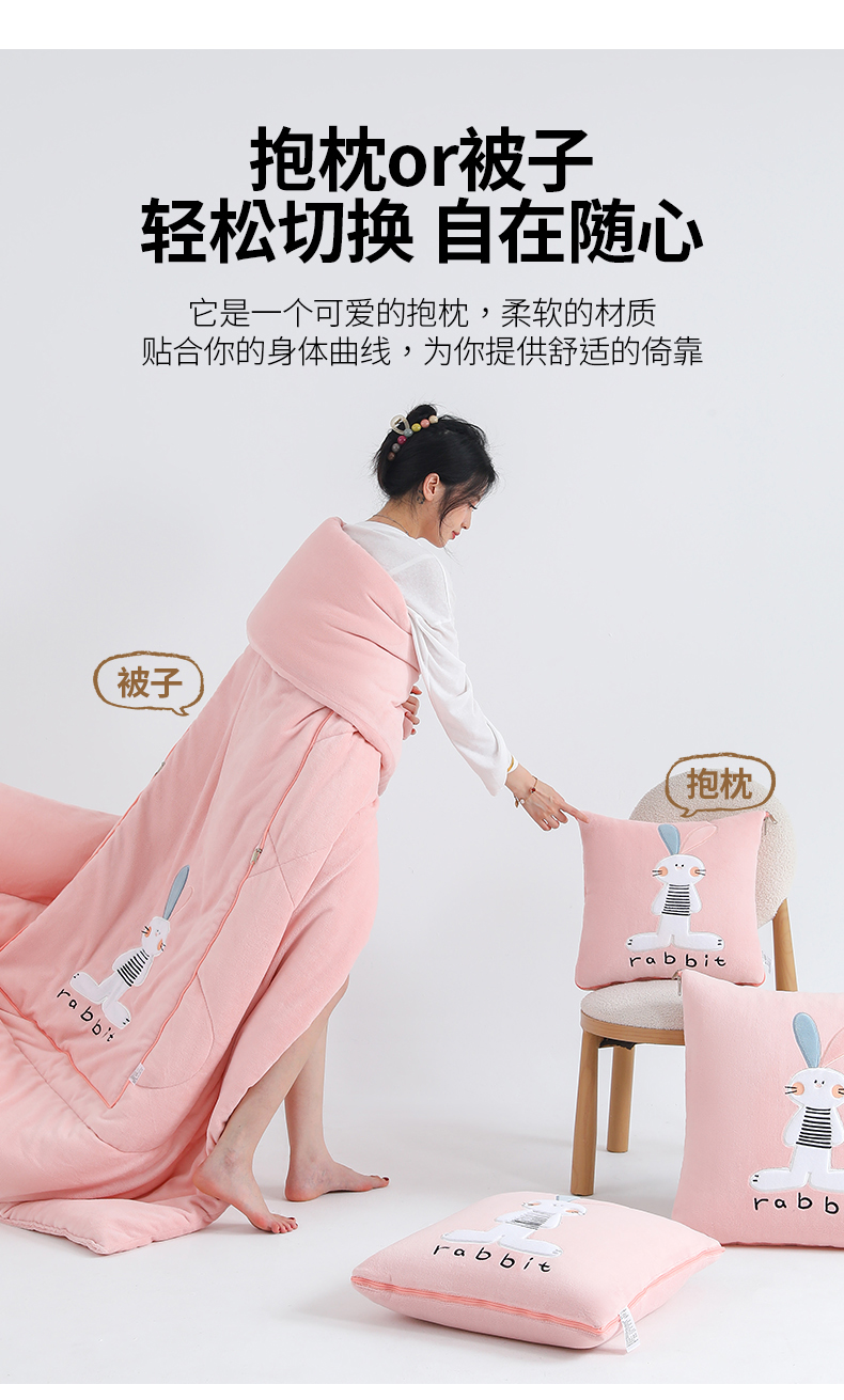 商品名称:翰轩家居 2025新款卡通牛奶绒贴布绣抱枕被-梦幻兔系列 梦幻兔-樱花粉
