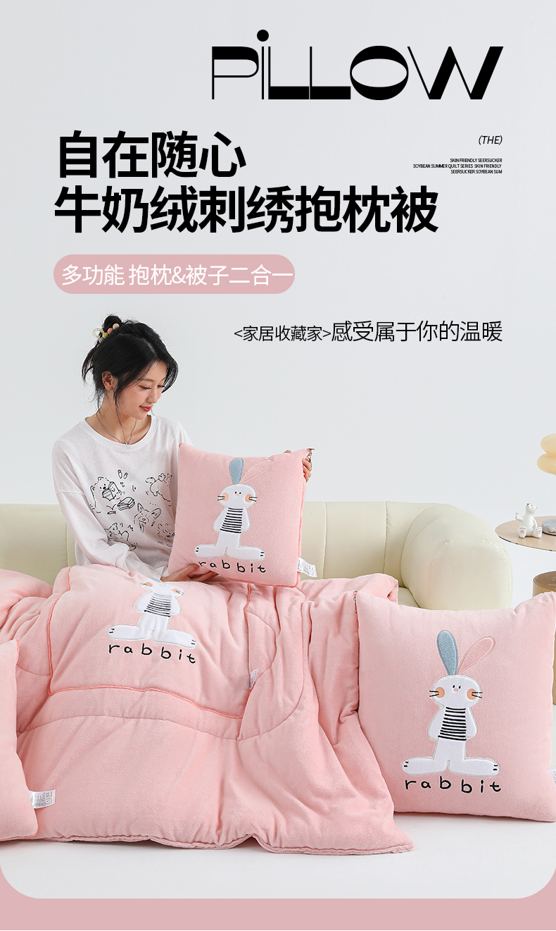 (总)翰轩家居 2025新款卡通牛奶绒贴布绣抱枕被-梦幻兔系列,梦幻兔-高级灰,梦幻兔-咖啡棕,梦幻兔-魔芋紫,梦幻兔-天空蓝,梦幻兔-樱花粉