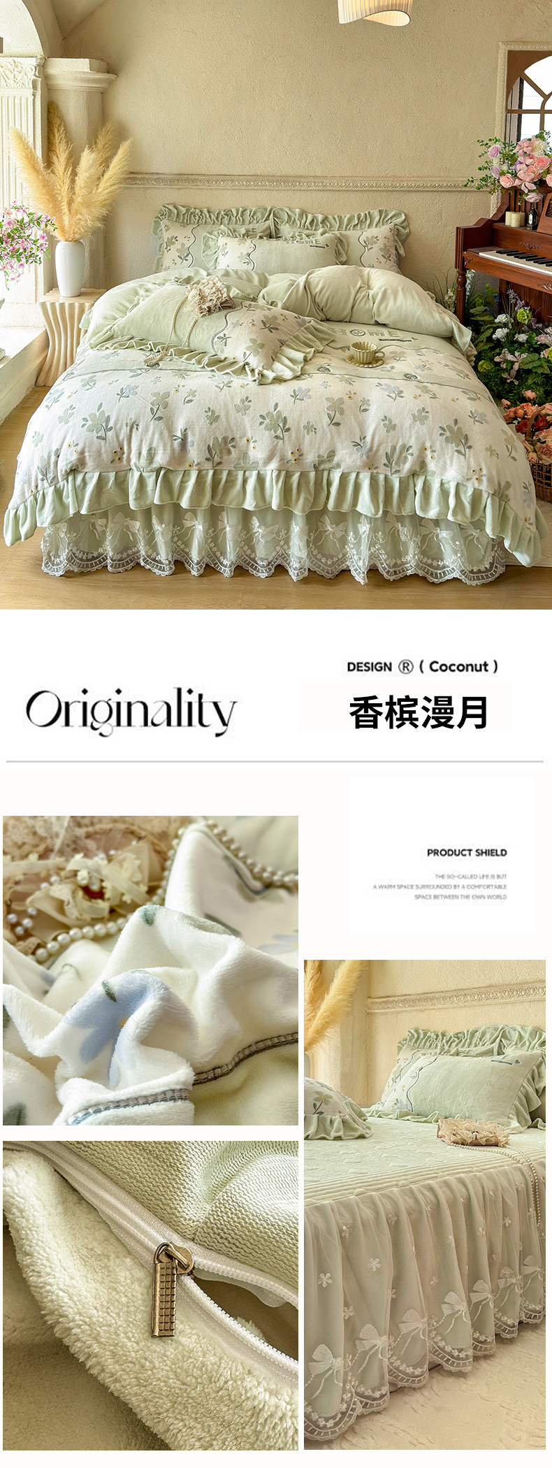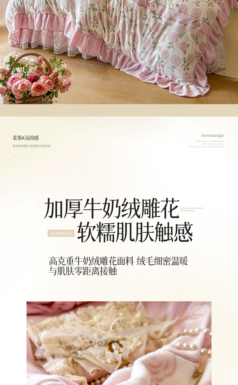 宜凡家纺 2025新款牛奶绒雕花拼接刺绣床裙四件套 晨雾蔷薇
