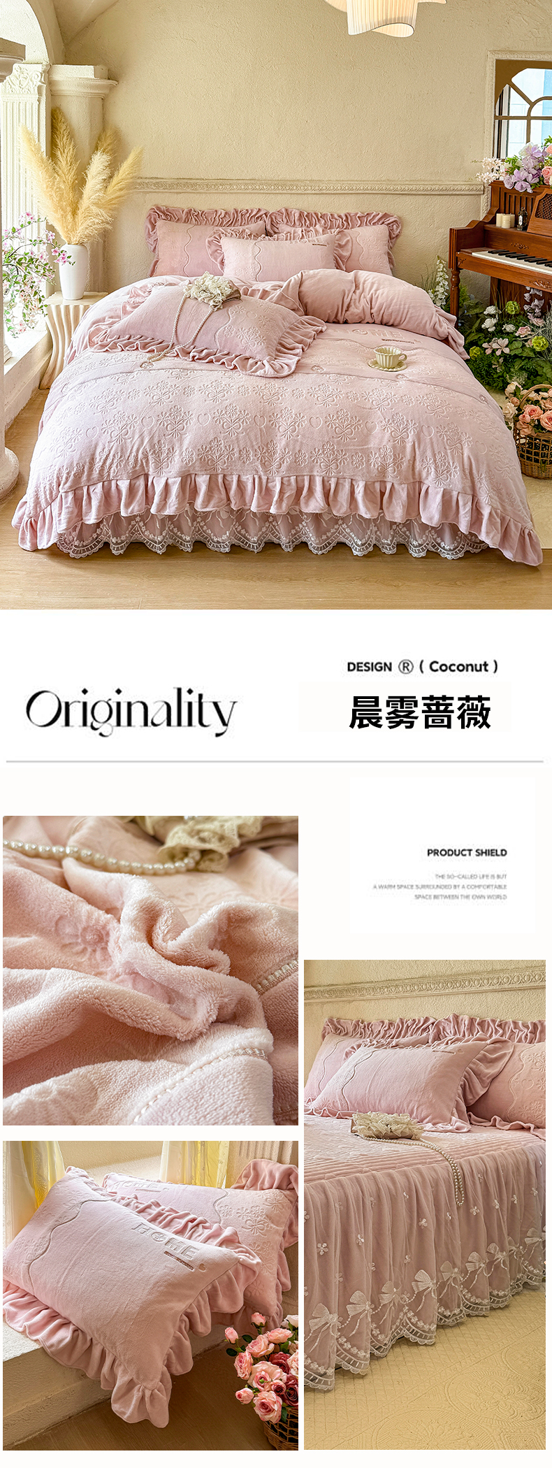 商品名称:宜凡家纺 2025新款牛奶绒雕花拼接刺绣床裙四件套 晨雾蔷薇